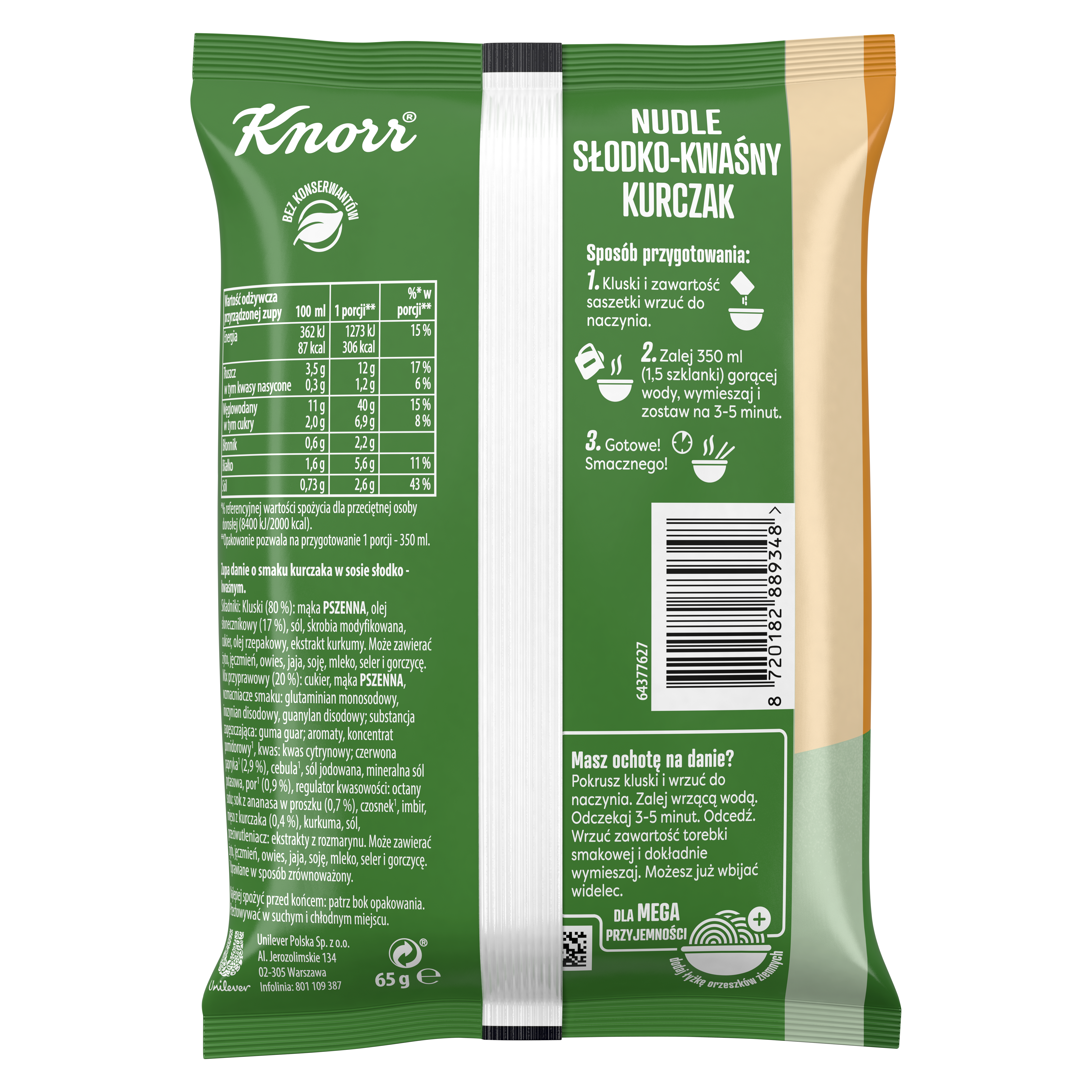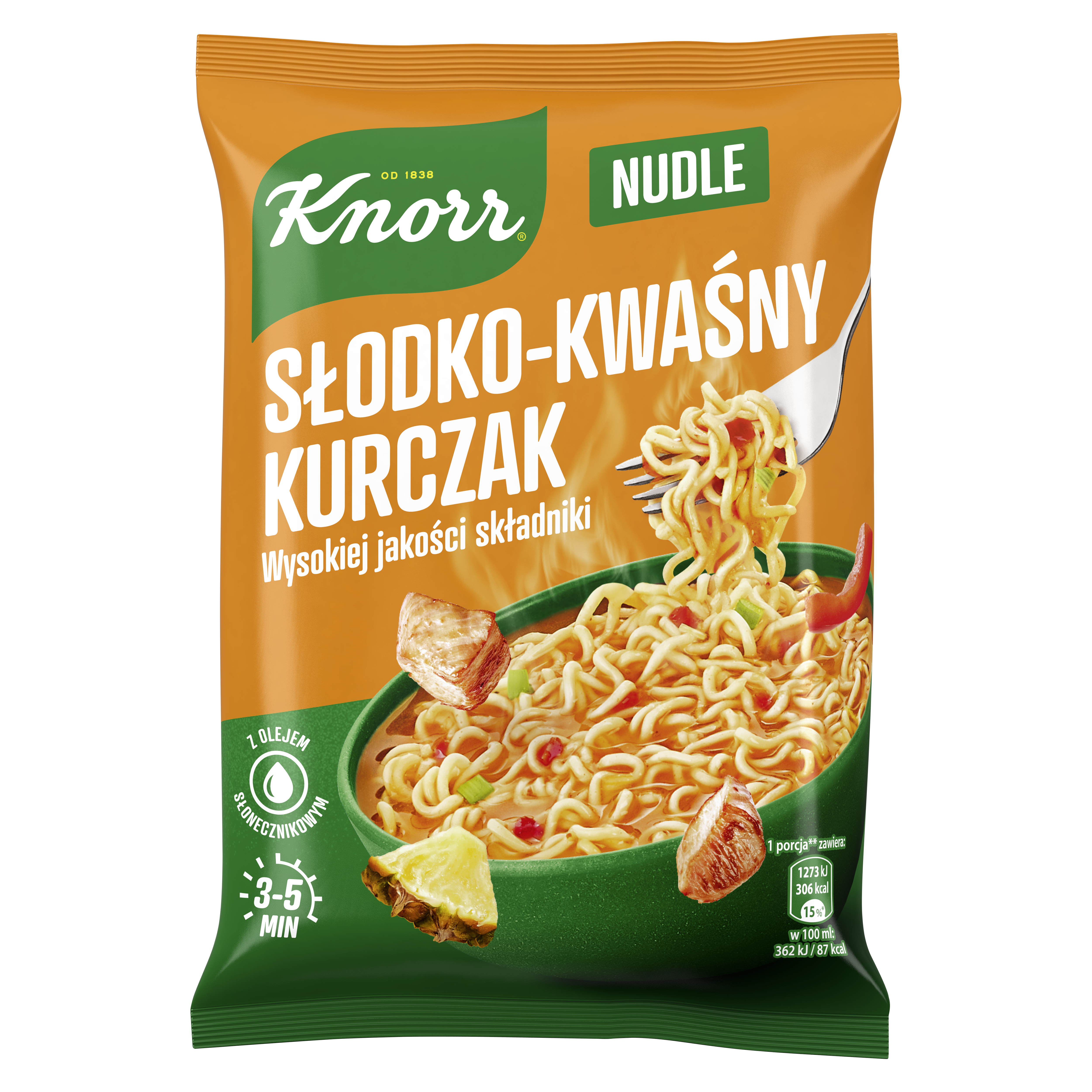 | Składniki | Kluski (80%): mąka pszenna, olej słonecznikowy (17%), sól, skrobia modyfikowana, cukier, olej rzepakowy, ekstrakt kurkumy. może zawierać żyto, jęczmień, owiec, jaja, soję, mleko, seler i gorczycę. mix przyprawowy (20%): cukier, mąka pszenna, wzmacniacze smaku: glutaminian monosodowy, inozynian disodowy, guanylan disodowy; substancja zagęszczająca: guma guar; aromaty, koncentrat pomidorowy*, kwa: kwas cytrynowy; czerwona papryka (2,9%), cebula*, sól jodowana, mineralna sól potasowa, por* (0.9%), regulator kwasowości: octany sodu; sok z ananasa w proszku (0,7%), czosnek*, imbir, pierś z kurczaka (0,4%), kurkuma, sól, przeciwutleniacz: ekstrakty z rozmarynu. może zawierać pszenicę, żyto, jęczmień, owies, jaja, soję, mleko, seler i gorczycę. *uprawiane w sposób zrównoważony. |