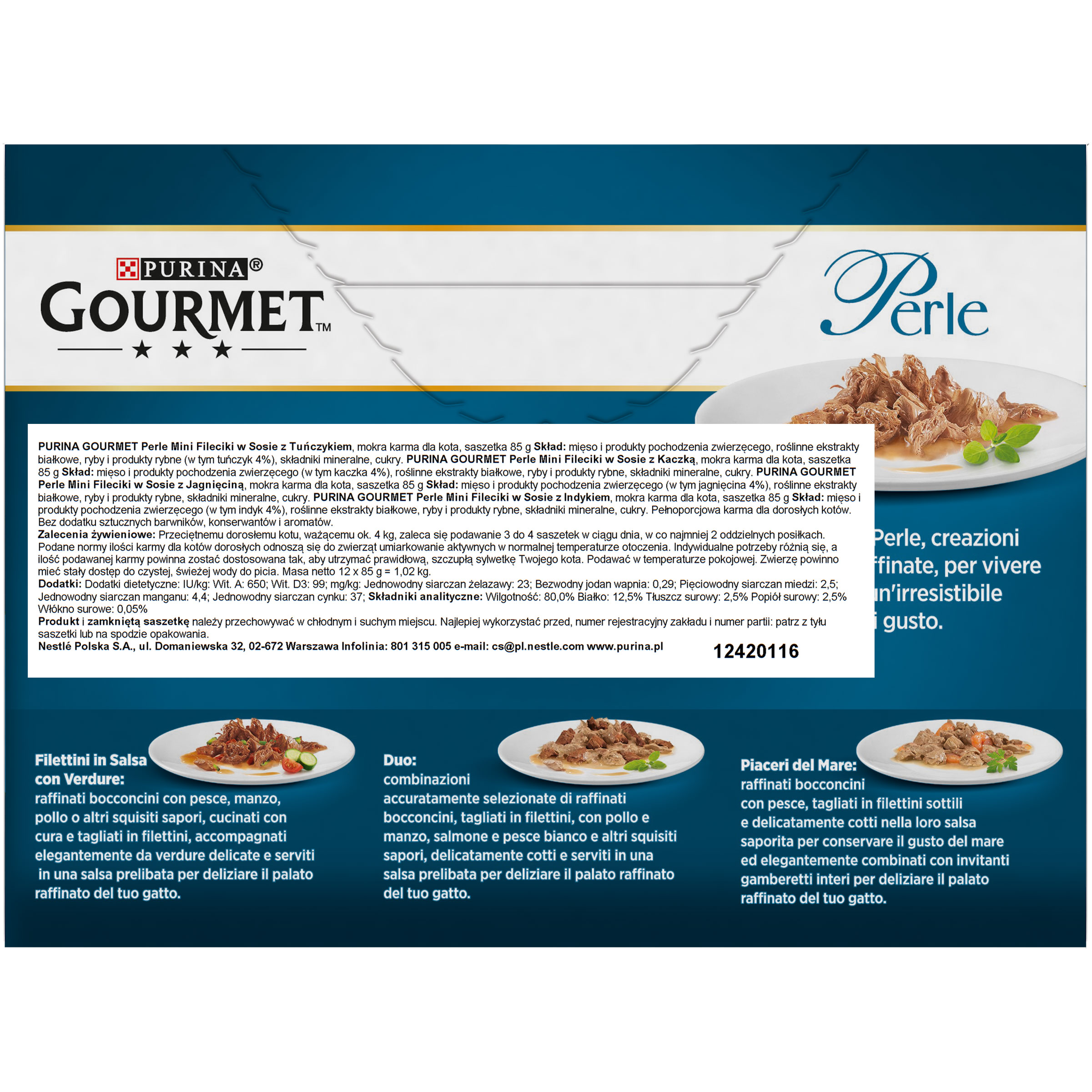 Gourmet Perle z przyjemnością prezentuje Kolekcję Mini Mini Filecików w Sosie. Twój rozpieszczony koneser pokocha delikatność naszych czterech smakowitych filecików: z indykiem, tuńczykiem, kaczką, czy jagnięciną, a każda porcja sprawi, że posiłek będzie smakowity do ostatniego kawałka. Zrealizuj wygórowane oczekiwania Twojego kota przepyszną recepturą, która spełni jego namiętność do wybornych dań. Luksus! Gourmet Perle stworzył Mini Fileciki w Sosie: starannie dobrane składniki przygotowane z troską o wyjątkowy smak, pocięte na małe fileciki i podawane w pysznym sosie, aby zachwycić wyrafinowane podniebienie Twojego kota. Mini Fileciki w Sosie od Gourmet Perle, elegancka pokusa dla wyjątkowych doznań smakowych każdego dnia. Pełnoporcjowa, w pełni zbilansowana karma dla dorosłych kotów. Bez dodatku sztucznych barwników, konserwantów i aromatów.