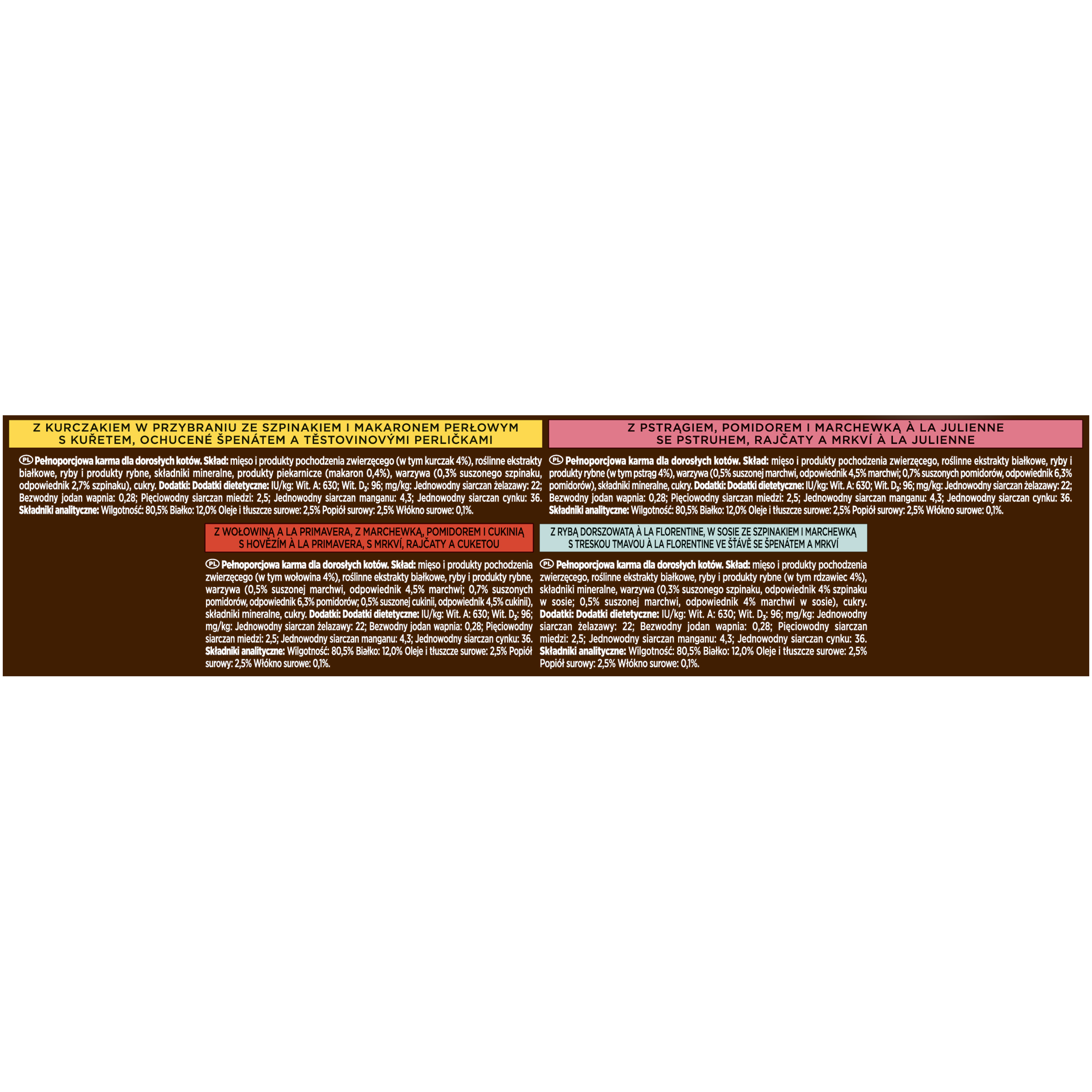 | Skład | Z kurczakiem w przybraniu ze szpinakiem i makaronem perłowym: mięso i produkty pochodzenia zwierzęcego (w tym kurczak 4%), roślinne ekstrakty białkowe, ryby i produkty rybne, składniki mineralne, produkty piekarnicze (makaron 0,4%), warzywa (0,3% suszonego szpinaku, odpowiednik 2,7% szpinaku), cukry z pstrągiem, pomidorem i marchewką à la julienne: mięso i produkty pochodzenia zwierzęcego, roślinne ekstrakty białkowe, ryby i produkty rybne (w tym pstrąg 4%), warzywa (0,5% suszonej marchwi, odpowiednik 4,5% marchwi; 0,7% suszonych pomidorów, odpowiednik 6,3% pomidorów), składniki mineralne, cukry z wołowiną a la primavera, z marchewką, pomidorem i cukinią: mięso i produkty pochodzenia zwierzęcego (w tym wołowina 4%), roślinne ekstrakty białkowe, ryby i produkty rybne, warzywa (0,5% suszonej marchwi, odpowiednik 4,5% marchwi; 0,7% suszonych pomidorów, odpowiednik 6,3% pomidorów; 0,5% suszonej cukinii, odpowiednik 4,5% cukinii), składniki mineralne, cukry z rybą dorszowatą à la florentine, w sosie ze szpinakiem i marchewką: mięso i produkty pochodzenia zwierzęcego, roślinne ekstrakty białkowe, ryby i produkty rybne (w tym rdzawiec 4%), składniki mineralne, warzywa (0,3% suszonego szpinaku, odpowiednik 4% szpinaku w sosie; 0,5% suszonej marchwi, odpowiednik 4% marchwi w sosie), cukry |