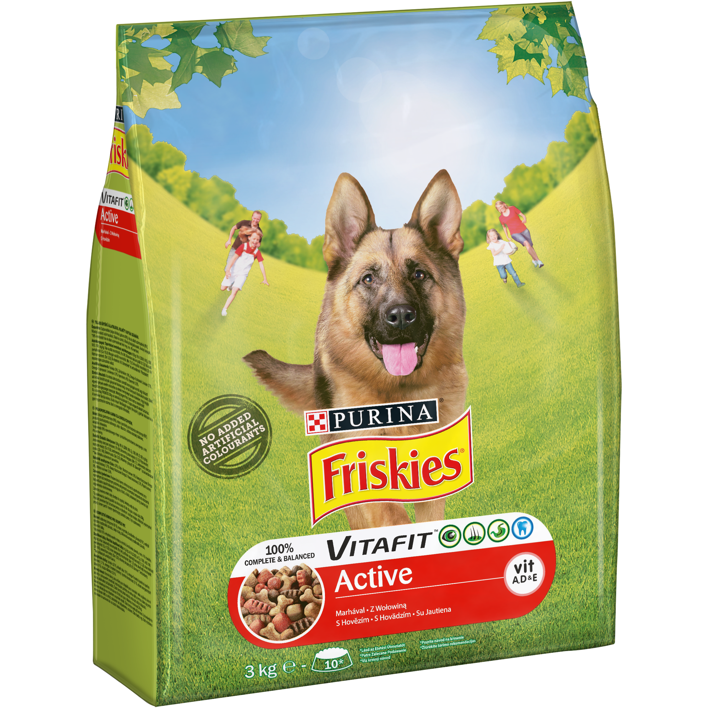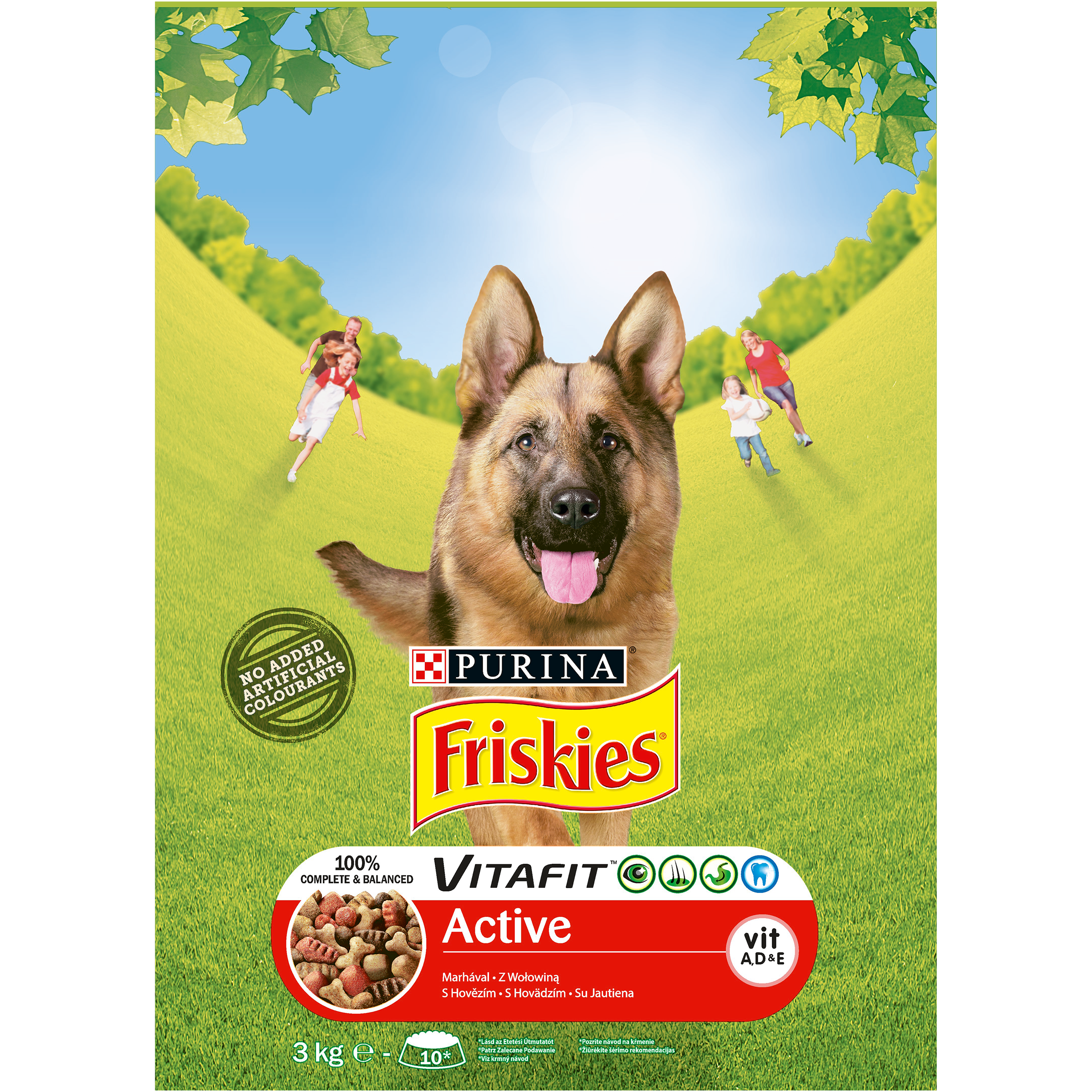 Purina Friskies Vitafit Active to smaczna karma z wołowiną, połączona z pełnymi ziarnami, witaminami z grupy B oraz kwasami tłuszczowymi Omega 3 i 6. Friskies Active to karma dopasowana do psów pełnych energii, które zawsze mają ochotę na zabawę.