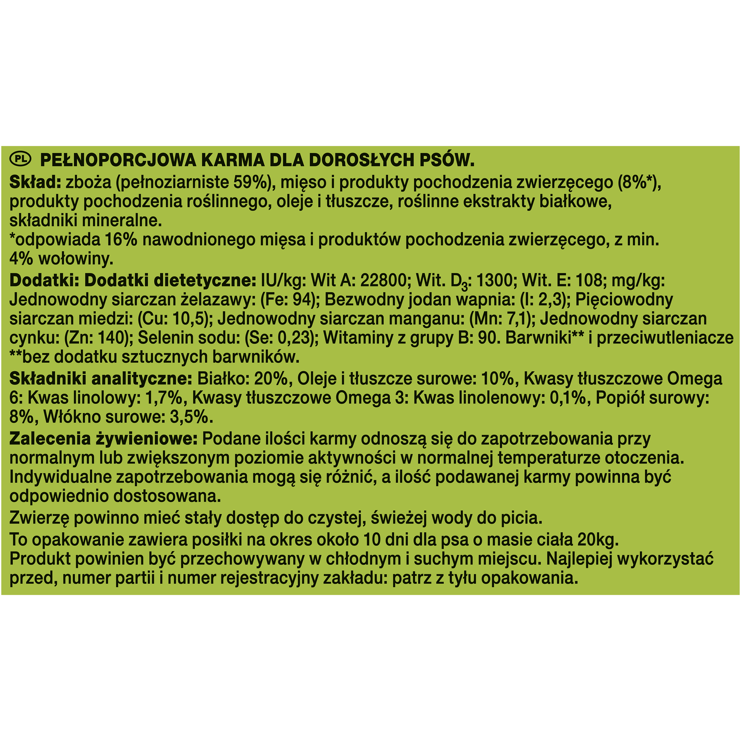 | Skład | Zboża (pełnoziarniste 59%) mięso i produkty pochodzenia zwierzęcego (8%*) produkty pochodzenia roślinnego oleje i tłuszcze roślinne ekstrakty białkowe składniki mineralne *odpowiada 16% nawodnionego mięsa i produktów pochodzenia zwierzęcego, z min. 4% wołowiny |