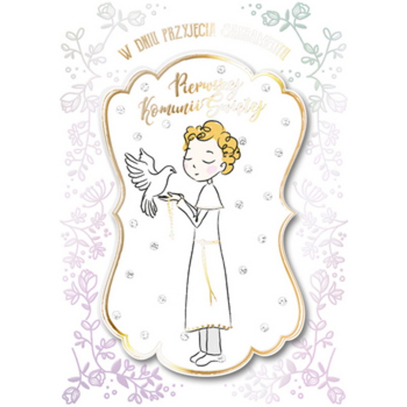 Karnet DK-725 Komunia Kartka B6 z ozdobnej serii Dream Cards na Komunię - nieduża, ale robi wrażenie dzięki atrakcyjnej kolorystyce i ciekawym zdobieniom. To idealny wybór łączący przyjazną cenę z jakością. Cechy szczególne: wielkość: B6, 16.6 x 11.7 cm po złożeniu, koperta: w zestawie, biała zdobienia: różnorodne, bogate (w zależności od wzoru: przyklejane dekoracje, elementy biżuteryjne, odstawniki, metaliczne folie, tłoczenia itp.), okazja: Komunia