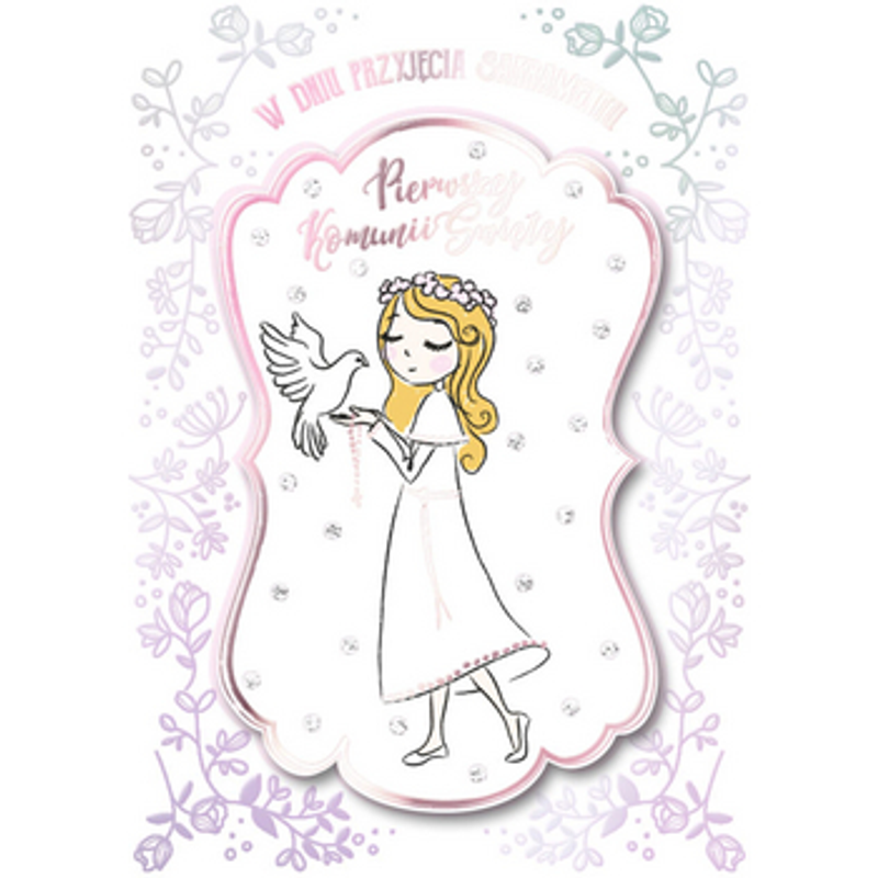 Karnet DK-726 Komunia Kartka B6 z ozdobnej serii Dream Cards na Komunię - nieduża, ale robi wrażenie dzięki atrakcyjnej kolorystyce i ciekawym zdobieniom. To idealny wybór łączący przyjazną cenę z jakością. Cechy szczególne: wielkość: B6, 16.6 x 11.7 cm po złożeniu, koperta: w zestawie, biała zdobienia: różnorodne, bogate (w zależności od wzoru: przyklejane dekoracje, elementy biżuteryjne, odstawniki, metaliczne folie, tłoczenia itp.), okazja: Komunia