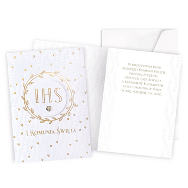 Karnet DK-961 Komunia Kartka B6 z ozdobnej serii Dream Cards na Komunię - nieduża, ale robi wrażenie dzięki atrakcyjnej kolorystyce i ciekawym zdobieniom. To idealny wybór łączący przyjazną cenę z jakością. Cechy szczególne: wielkość: B6, 16.6 x 11.7 cm po złożeniu, koperta: w zestawie, biała zdobienia: różnorodne, bogate (w zależności od wzoru: przyklejane dekoracje, elementy biżuteryjne, odstawniki, metaliczne folie, tłoczenia itp.), okazja: Komunia