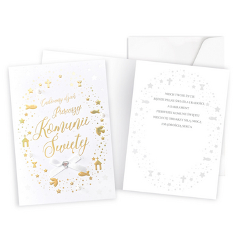 Karnet DK-965 Komunia Kartka B6 z ozdobnej serii Dream Cards na Komunię - nieduża, ale robi wrażenie dzięki atrakcyjnej kolorystyce i ciekawym zdobieniom. To idealny wybór łączący przyjazną cenę z jakością. Cechy szczególne: wielkość: B6, 16.6 x 11.7 cm po złożeniu, koperta: w zestawie, biała zdobienia: różnorodne, bogate (w zależności od wzoru: przyklejane dekoracje, elementy biżuteryjne, odstawniki, metaliczne folie, tłoczenia itp.), okazja: Komunia