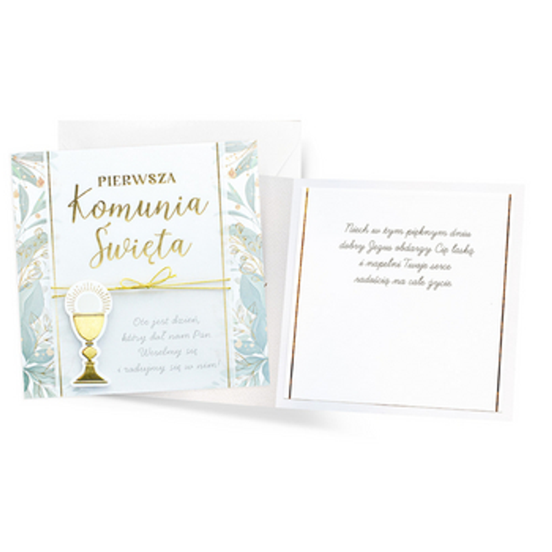 Kartki z serii Primus, to kartki najwyższej jakości, pięknie zdobione m.in złotą lub srebrną folią, tłoczeniami, czy wycinkami laserowymi. Idealne na najważniejsze okazje w życiu, takie jak ślub, komunia. W środku każdej kartki znajdują się dobrane do okazji życzenia, a do kartki dołączona jest dopasowana koperta. Cechy szczególne: wielkość: niestandardowa, prostokątna, kwadratowa, zdobienia: dekoracje ze złotej folii, doklejane koraliki, tłoczenia koperta: dopasowana w komplecie, wnętrze kartki: życzenia w środku, okazja: komunia