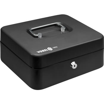 Przenośna kaseta na pieniądze o wymiarze 200x160x90mm. Wykonana z blachy stalowej o grubości 0,7mm, pomalowana w kolorze czarnym. Zamykana na zamek. W zestawie znajdują sie 2 klucze. Wewnątrz wyciągana wkładka na monety wykonana z tworzywa sztucznego.