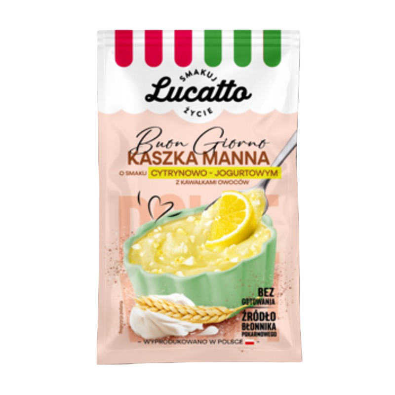 Buon giorno Kasza manna jogurt cytryna Lucatto – kremowa lekkość z przyjemnie cytrusową świeżością i subtelną nutą jogurtu.