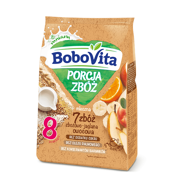 | Składniki | mleko modyfikowane 54,1% [odtłuszczone mleko w proszku, odmineralizowana serwatka w proszku (z mleka), oleje roślinne (słonecznikowy, rzepakowy, wysokooleinowy słonecznikowy, kokosowy), witaminy i składniki mineralne (C, E, A, D, biotyna, tiamina, B6, wapń, żelazo, jod)], pełnoziarniste mąki 35,8% (pszenna 33%, z pszenicy orkisz 0,7%), proszek jabłkowy 4%, płatki bananowe 2%, proszek pomarańczowy 2% (suszona pomarańcza, maltodekstryna, mąka ryżowa), płatki gruszkowe 0,9% (suszona gruszka, mąka ryżowa), mąka gryczana 0,7%, mąka ryżowa 0,7%. |
