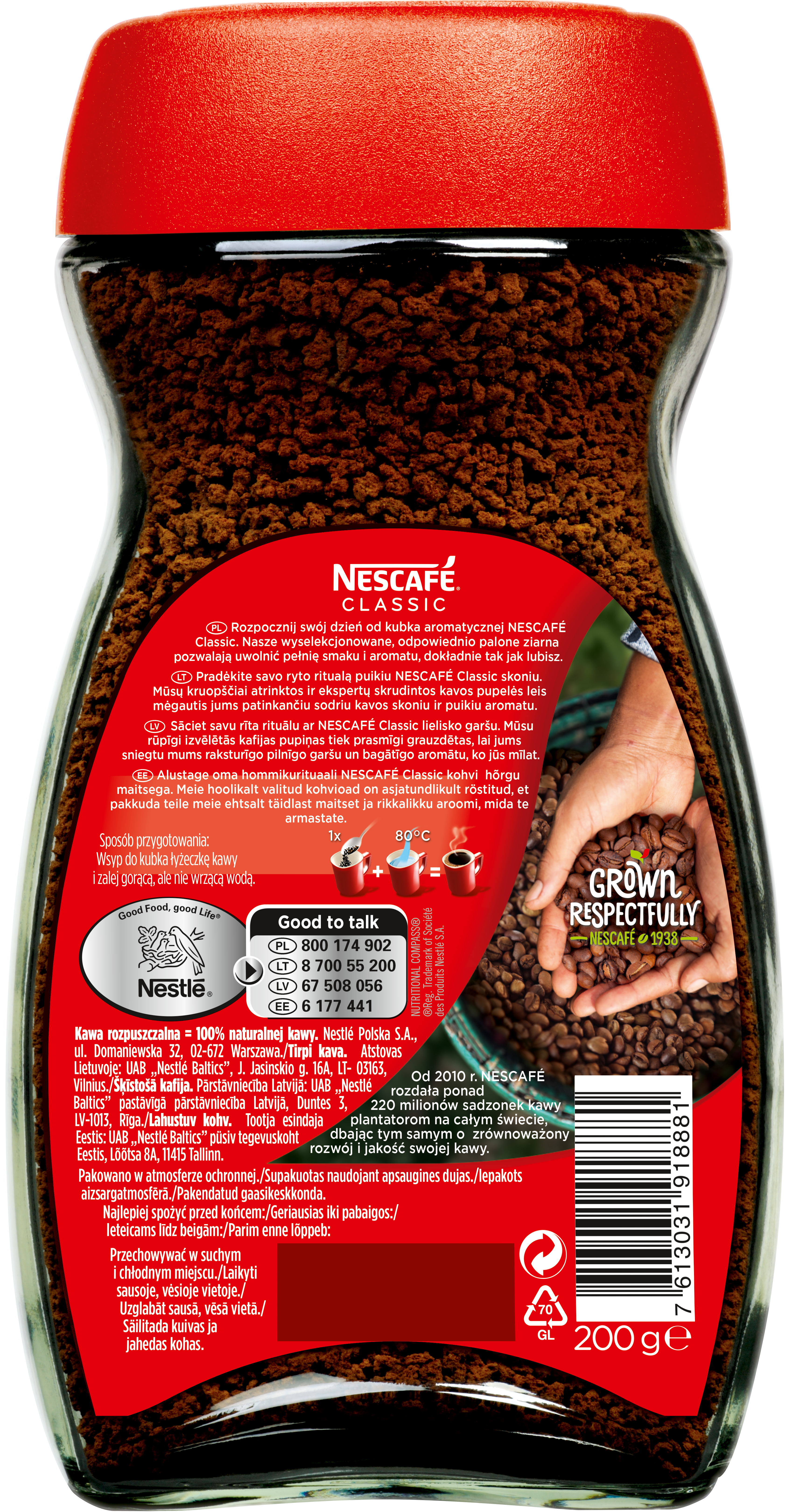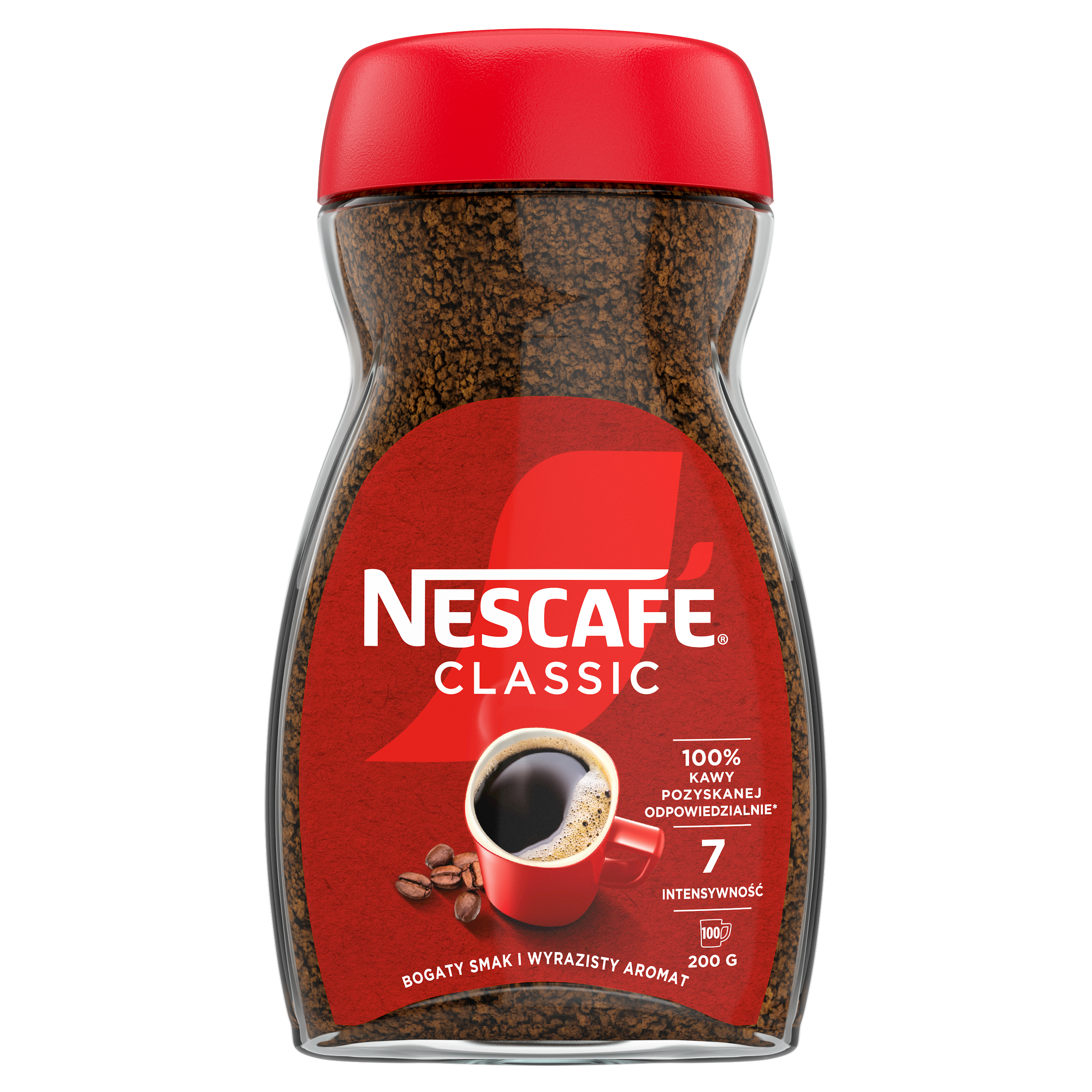Zacznij dzień z Nescafé Classic, najpopularniejszą kawą rozpuszczalną w Polsce i na świecie. Dostępną na rynku od ponad 80 lat w ponad 180 krajach! To kawa stworzona dla prawdziwych wielbicieli prawdziwie kawowego smaku, którzy nie wyobrażają sobie dnia bez kubka aromatycznej kawy. Tę wyjątkową kompozycję tworzą średnio palone ziarna Robusty pochodzące z rejonu Wietnamu oraz Indonezji. Wyróżnia ją niepowtarzalny smak i bogaty aromat. Charakteryzuje się mocną nutą, wyrazistym, kawowym smakiem oraz niską kwasowością. Dzięki zaawansowanej technologii podwójnej filtracji pozostawia to, co najlepsze w kawie - pełniejszy smak pozbawiony goryczy oraz głęboki aromat świeżo zmielonych ziaren. To idealna kawa na dobry początek dnia. Dostępna również w wariancie bez kofeiny. Nescafé Classic to: - Niepowtarzalny, bogaty aromat i pełny smak kawy rozpuszczalnej - Stworzona z średnio palonych ziaren Robusty pochodzących z rejonu Wietnamu oraz Indonezji - Mocna nuta kawowa, wyrazisty smak oraz niska kwasowość - Zaawansowana technologia podwójnej filtracji zapewnia pełniejszy smak i aromat - Stworzona w 100% z ziaren kawy pochodzących ze zrównoważonych upraw - Dostępna w słoikach 200 g, 100 g, 50 g, torbie 75 g oraz saszetkach 2 g.