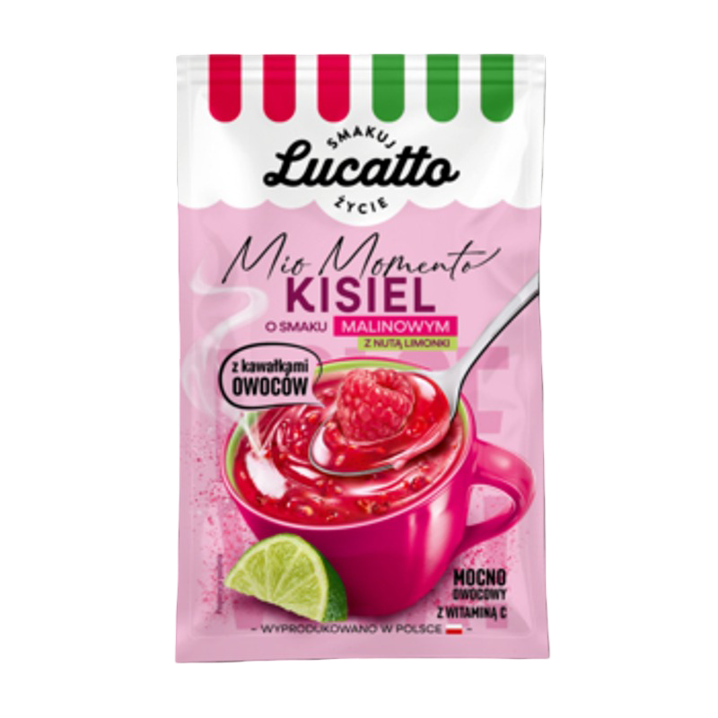 Mio momento – chwila dolce vita w kubku . Kisiel instant o smaku maliny z nutą limonki i kawałkami owoców przygotujesz w kilka chwil – wystarczy 175 ml wrzątku.