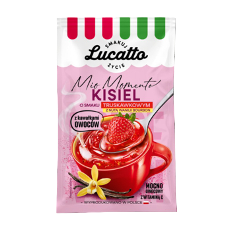 Kisiel instant o smaku truskawki z nutą wanilii Bourbon i kawałkami owoców przygotujesz w kilka chwil – wystarczy 175 ml wrzątku.