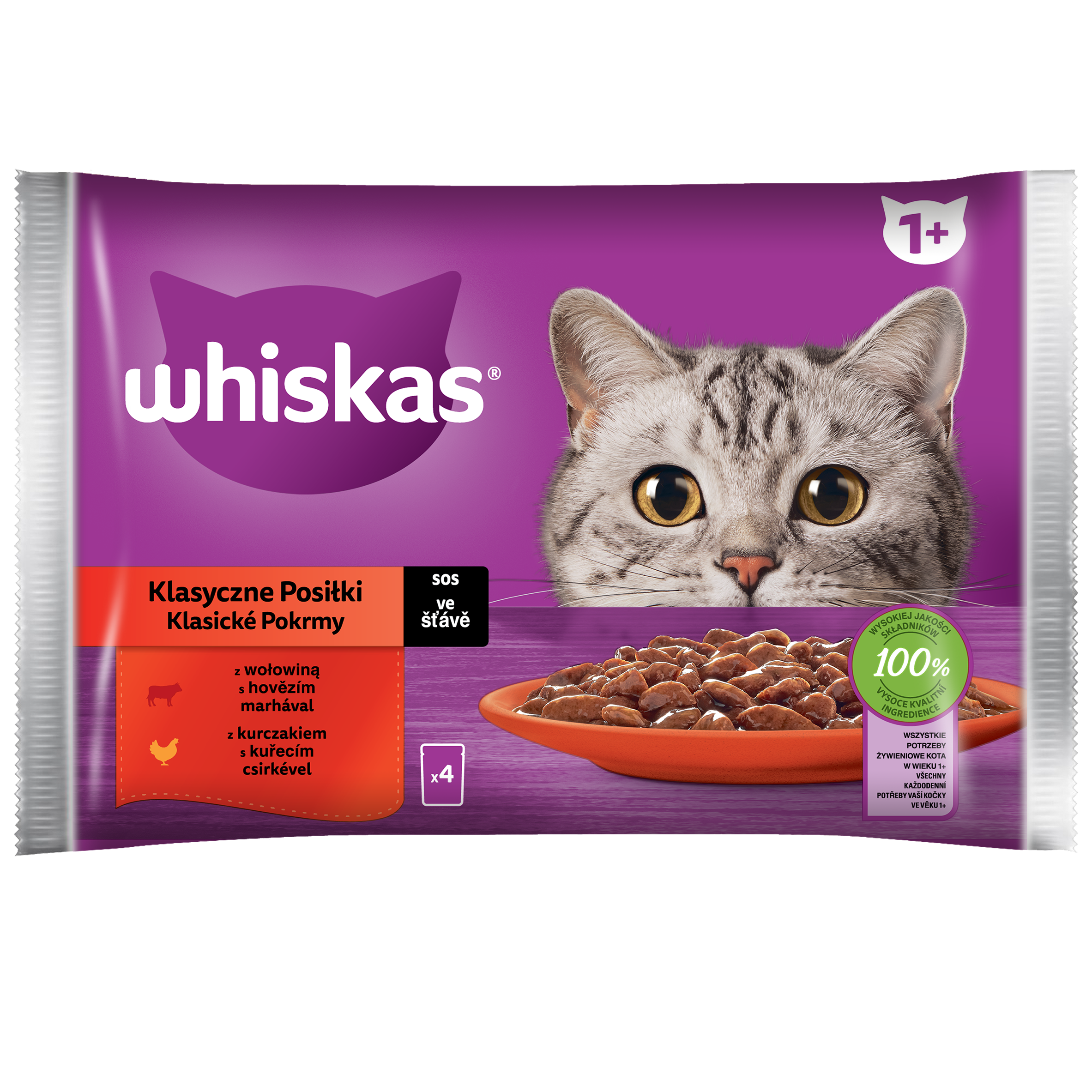 • Klasyczne posiłki 1+ Sos z wołowiną i z kurczakiem Whiskas 340 g (4x85g)