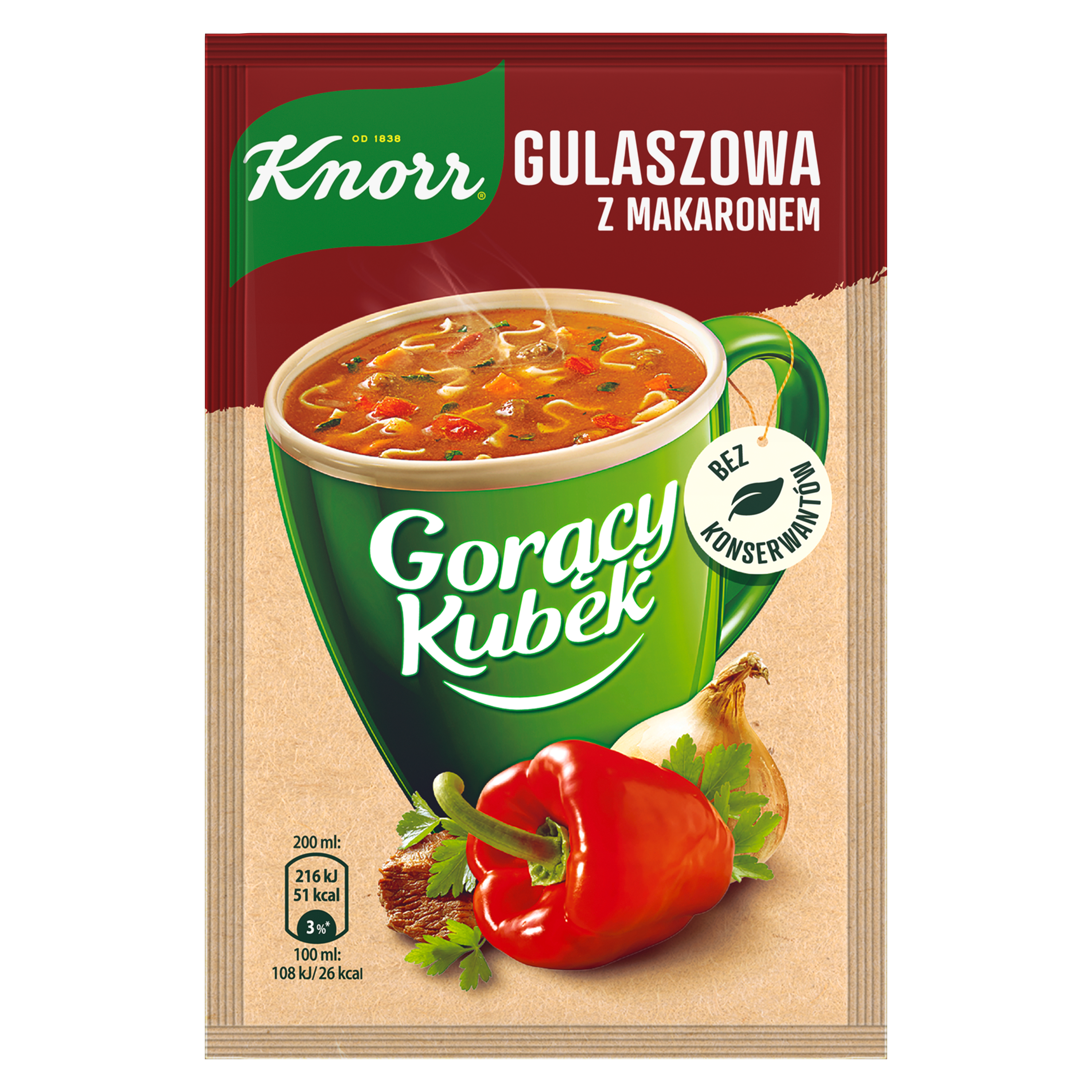 | Składniki | Skrobia, cebula (13%), makaron (9,5%) (mąka pszenna semolina, sól), ekstrakt drożdżowy, mielona papryka (8,5%), syrop glukozowy, sól jodowana, sól, koncentrat pomidorowy (3,5%), cukier, czosnek (2%), aromaty (w tym mleko), mięso wołowe (0,9%), czerwona papryka (0,8%), natka pietruszki (0,5%), majeranek, syrop karmelowy, kminek, maltodekstryna, białko jaja kurzego, korzeń pietruszki. może zawierać seler, gorczycę, soję i inne zboża zawierające gluten. |
