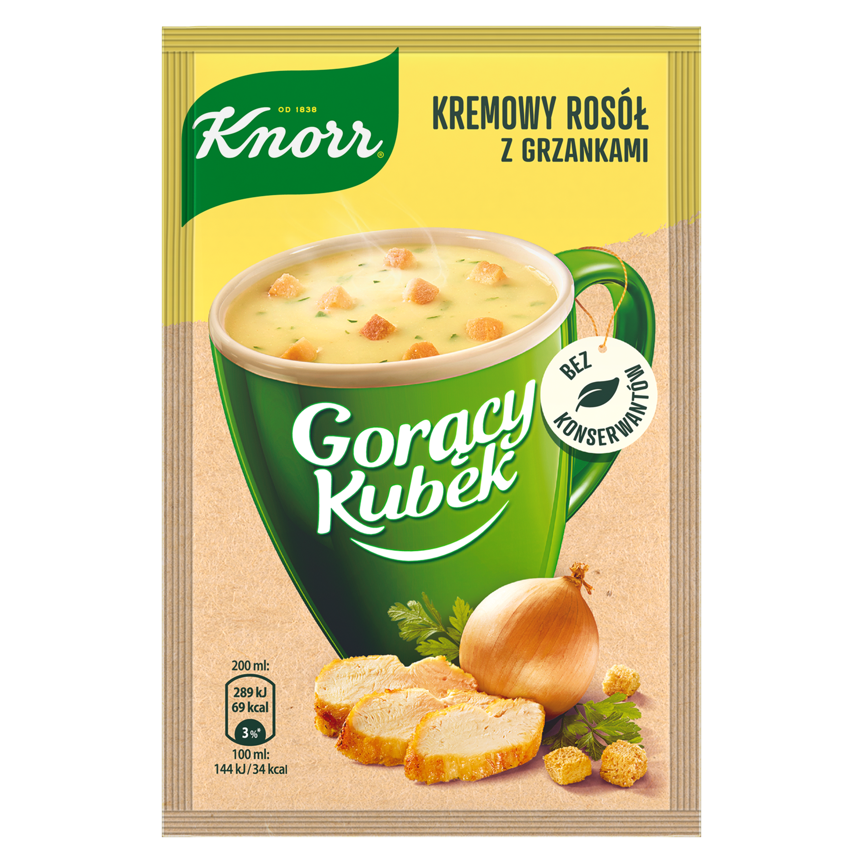 Knorr Gorący Kubek Kremowy Rosół z grzankami to smaczna, sycąca i wymagająca mniej niż 2 minut przygotowania przekąska bez konserwantów, skomponowana ze starannie dobranych składników wysokiej jakości. Ten Kremowy Rosół zaspokoi głód nawet najbardziej wybrednych smakoszy. Jego gładka, kremowa konsystencja i intensywny smak kurczaka sprawiają, że każdy kubek tego dania to moment czystej rozkoszy dla zmysłów. Na bogatą kompozycję smakową zupy składają się wysokiej jakości składniki, w tym znane i lubiane warzywa i przyprawy, takie jak: pieprz, kurkuma, natka pietruszki czy czosnek. Idealna na szybką przekąskę i szybkie danie na ciepło zupa błyskawiczna jest nie tylko smaczna, ale i prosta w przygotowaniu. Wystarczą tylko 2 minuty, by móc cieszyć się kremowym smakiem tego aromatycznego, bogato przyprawionego rosołu, który zaspokoi pierwszy głód i odpowiednio Cię rozgrzeje. Po prostu wsyp zawartość torebki do kubka, zalej wrzątkiem, wymieszaj i odczekaj. Właśnie dlatego, że tę zupę tak łatwo przygotować, świetnie sprawdzi się ona w podróży, w pracy, na uczelni czy nawet w domu, gdy brakuje Ci czasu. Krótko mówiąc: na jego bogaty smak możesz liczyć zawsze wtedy, gdy się spieszysz i doskwiera Ci głód, niezależnie od tego, gdzie jesteś. Jeśli Kremowy Rosół z grzankami zadowolił Twoje podniebienie, koniecznie skosztuj także innych zup Knorr Gorący Kubek. Może do gustu przypadnie Ci zupa pomidorowa, zupa serowa z grzankami, barszcz czerwony lub zupa ogórkowa?