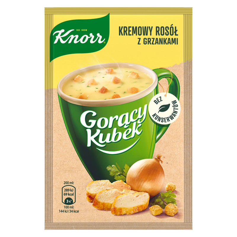Knorr Gorący Kubek Kremowy Rosół z grzankami to smaczna, sycąca i wymagająca mniej niż 2 minut przygotowania przekąska bez konserwantów, skomponowana ze starannie dobranych składników wysokiej jakości. Ten Kremowy Rosół zaspokoi głód nawet najbardziej wybrednych smakoszy. Jego gładka, kremowa konsystencja i intensywny smak kurczaka sprawiają, że każdy kubek tego dania to moment czystej rozkoszy dla zmysłów. Na bogatą kompozycję smakową zupy składają się wysokiej jakości składniki, w tym znane i lubiane warzywa i przyprawy, takie jak: pieprz, kurkuma, natka pietruszki czy czosnek. Idealna na szybką przekąskę i szybkie danie na ciepło zupa błyskawiczna jest nie tylko smaczna, ale i prosta w przygotowaniu. Wystarczą tylko 2 minuty, by móc cieszyć się kremowym smakiem tego aromatycznego, bogato przyprawionego rosołu, który zaspokoi pierwszy głód i odpowiednio Cię rozgrzeje. Po prostu wsyp zawartość torebki do kubka, zalej wrzątkiem, wymieszaj i odczekaj. Właśnie dlatego, że tę zupę tak łatwo przygotować, świetnie sprawdzi się ona w podróży, w pracy, na uczelni czy nawet w domu, gdy brakuje Ci czasu. Krótko mówiąc: na jego bogaty smak możesz liczyć zawsze wtedy, gdy się spieszysz i doskwiera Ci głód, niezależnie od tego, gdzie jesteś. Jeśli Kremowy Rosół z grzankami zadowolił Twoje podniebienie, koniecznie skosztuj także innych zup Knorr Gorący Kubek. Może do gustu przypadnie Ci zupa pomidorowa, zupa serowa z grzankami, barszcz czerwony lub zupa ogórkowa?