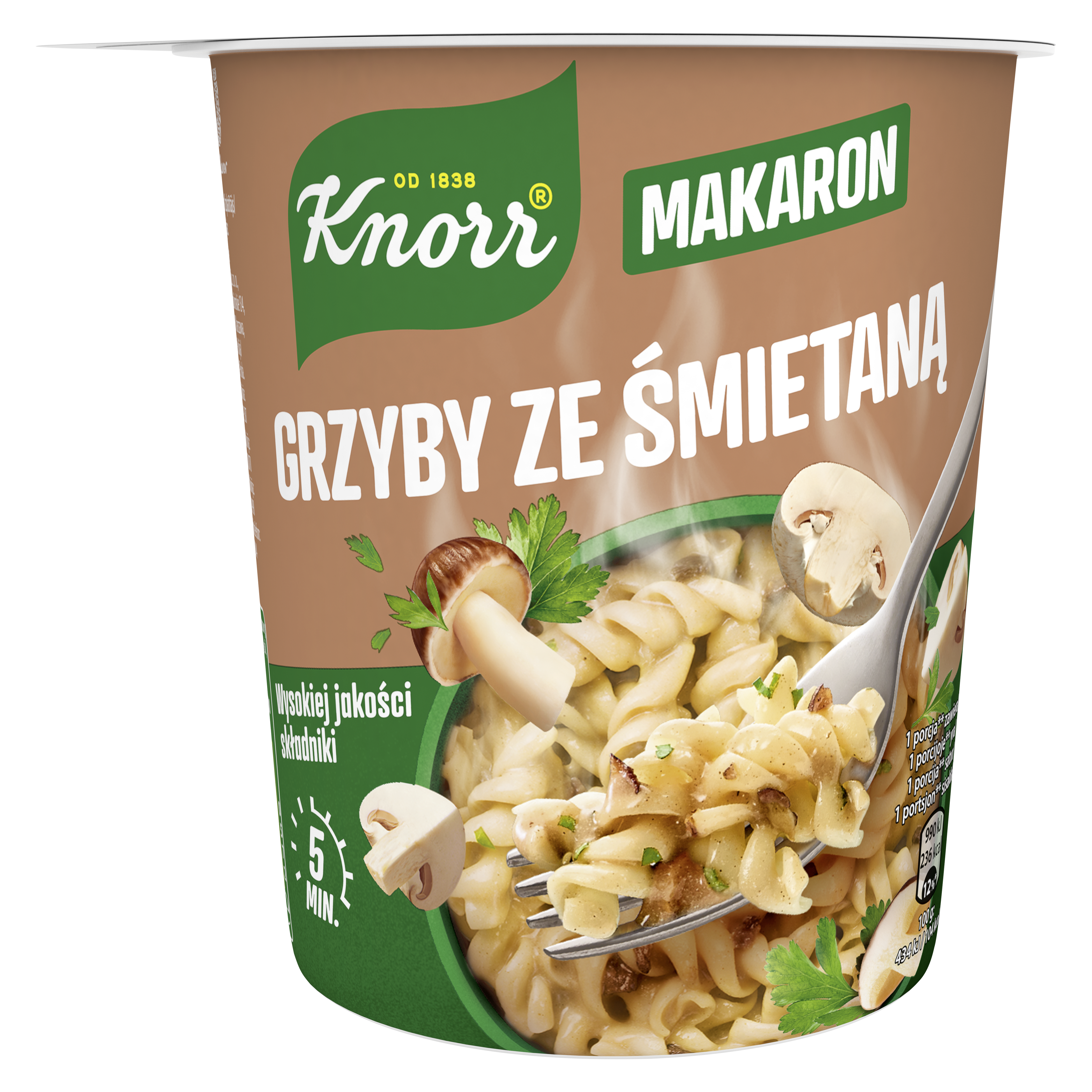 Masz jedynie kilka chwil, by coś przekąsić? Czas na… grzybobranie. Sięgnij po Danie w kubku Knorr Makaron grzyby ze śmietaną. Wystarczy zaledwie 5 minut i oto jest – pyszne, pożywne, dokładnie takie, jak lubisz. Borowiki, maślaki i pieczarki – ten aromat zawróci ci w głowie. Wyrazisty grzybowy smak w połączeniu z makaronem oraz delikatnym śmietanowym sosem – zasmakuj już dziś!