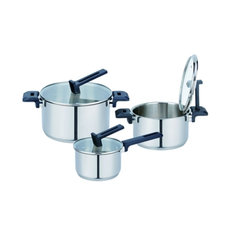 Garnki z wysokiej jakości stali nierdzewnej. Rączki bakelitowe o wyjątkowym kształcie, zapewniające wygodne użytkowanie oraz umożliwiające oparcie pokrywki. Garnki w nowoczesnym i eleganckim kształcie z lustrzanym wykończeniem wewnątrz i na zewnątrz.