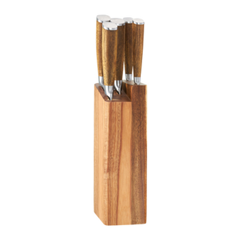 | W zestawie | Nóż szefa 20cm, nóż do pieczywa 20cm, nóż uniwersalny 20cm, nóż uniwersalny 13cm, nóż do obierania 9cm, blok do noży z drewna akacjowego |