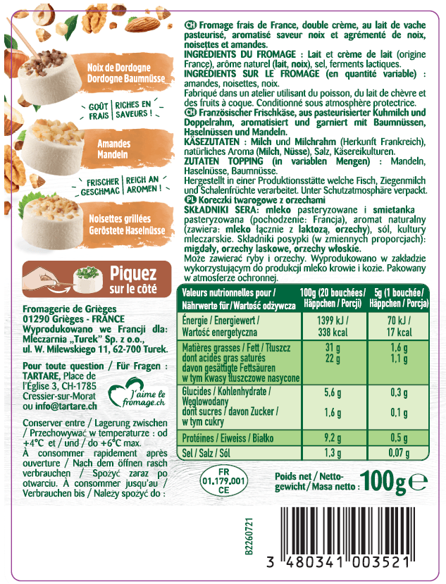 | Składniki | Mleko pasteryzowane i śmietanka pasteryzowana (pochodzenie: francja), aromat (zawiera: mleko łącznie z laktozą, orzechy), sól, kultury mleczarskie; składniki posypki (w zmiennych proporcjach): migdały orzechy laskowe, orzechy włoskie; |
