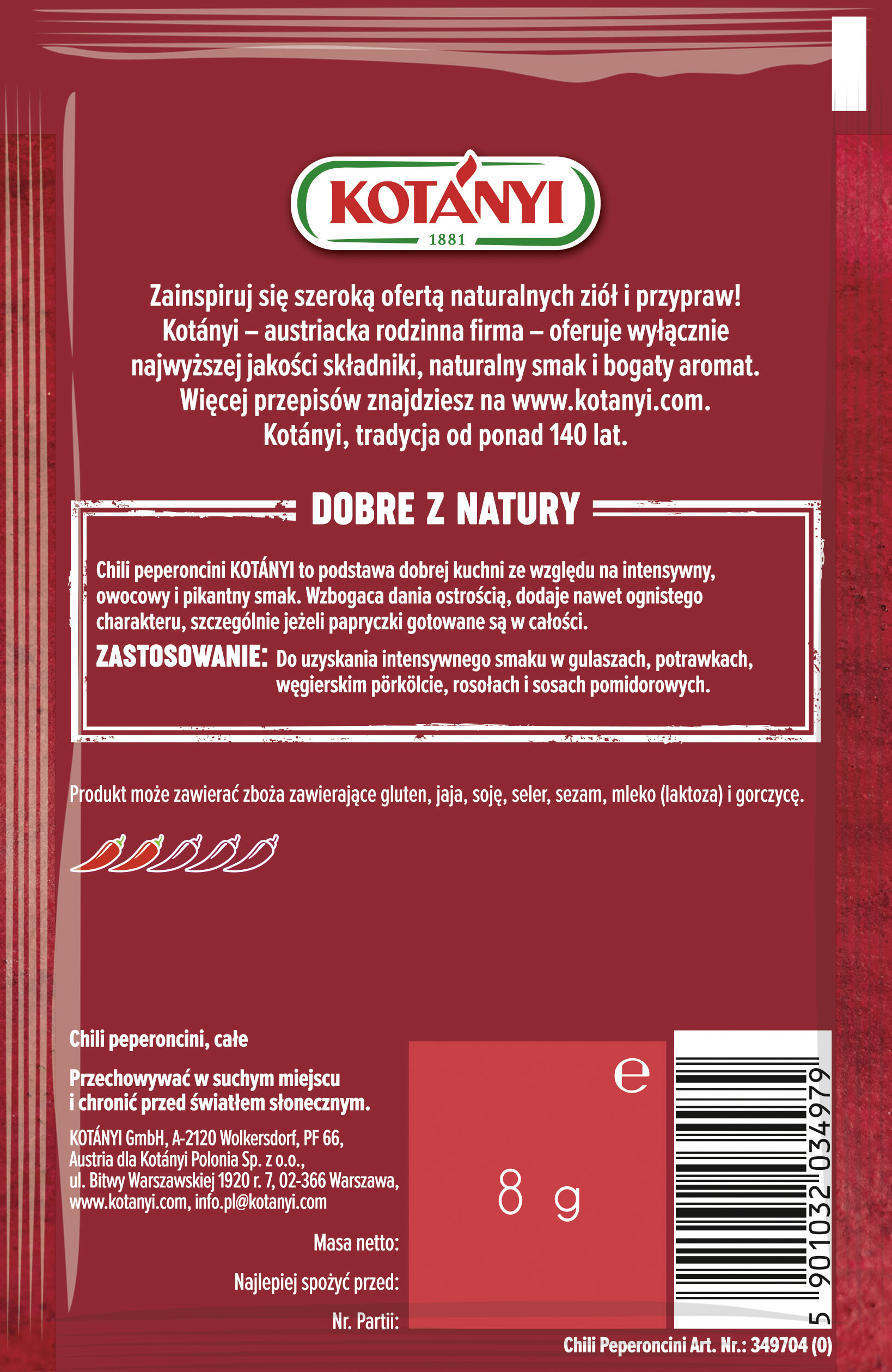 | Przeznaczenie | Chili peperoncini jest idealne do gulaszy, sosów, pieczonej wołowiny, wieprzowiny, drobiu, sałatek, zup i sosów pomidorowych. |