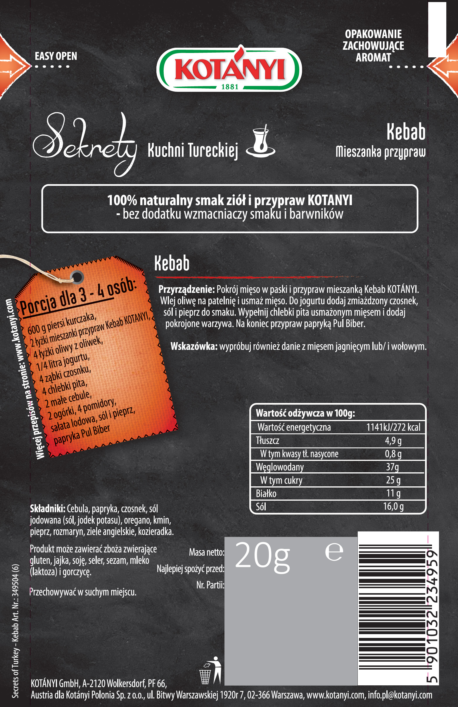 Sekrety Kuchni Tureckiej Kebab Mieszanka przypraw do szybkiego przygotowania Wszystko zaczęło się w 1881 r. od Janosa Kotányi i papryki. Wkrótce dołączyły inne drogocenne przyprawy i zioła z całego świata. Dziś, tak samo jak przed laty, są naszą największą pasją. Wieloletnie doświadczenie pozwala nam wyselekcjonować tylko najlepszej jakości składniki, aby uzyskać niepowtarzalny aromat Kotányi. 100% smak ziół i przypraw KOTÁNYI - bez dodatku wzmacniaczy smaku i barwników - aby w pełni cieszyć się wyjątkowością przygotowanych potraw. Z oryginalną Przyprawą do Doner Kebab KOTÁNYI przygotujecie Państwo prawdziwy specjał kuchni międzynarodowej! Odpowiednio dobrane zioła i przyprawy sprawią, że mięso stanie się wyjątkowo smaczne i aromatyczne. Zastosowanie: Wspaniale pasuje do cielęciny, wołowiny czy jagnięciny.