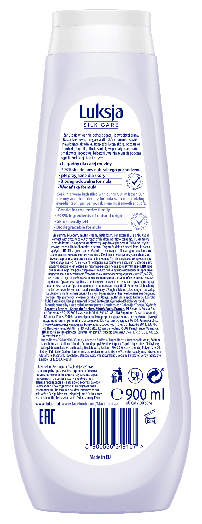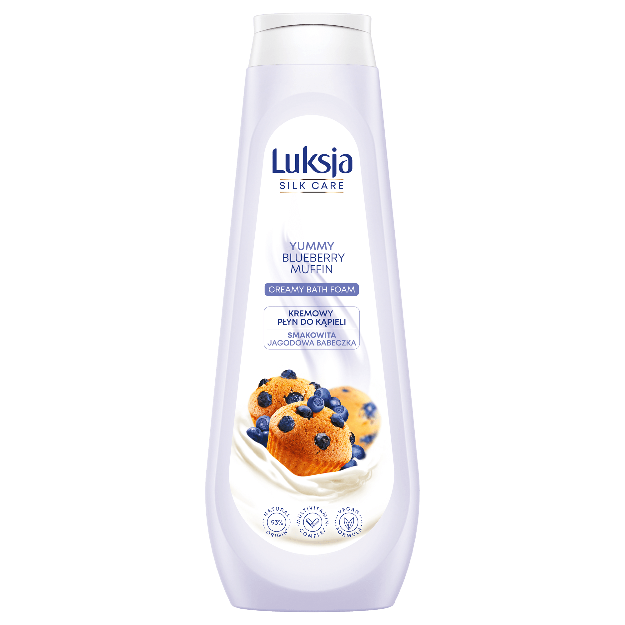 Zanurz się w wannie pełnej bogatej, jedwabistej piany. Kremowa, przyjazna dla skóry formuła Luksja Silk Care zawiera kompleks witamin. Rozpieści Twoją skórę, pozostawi ją miękką i gładką. Rozkoszuj się wspaniałym aromatem smakowitej jagodowej babeczki uwalniającym się podczas kąpieli. Zrelaksuj ciało i zmysły! Testowany dermatologicznie. Łagodny dla całej rodziny. pH przyjazne dla skóry. Biodegradowalna i wegańska formuła. 93% składników pochodzenia.