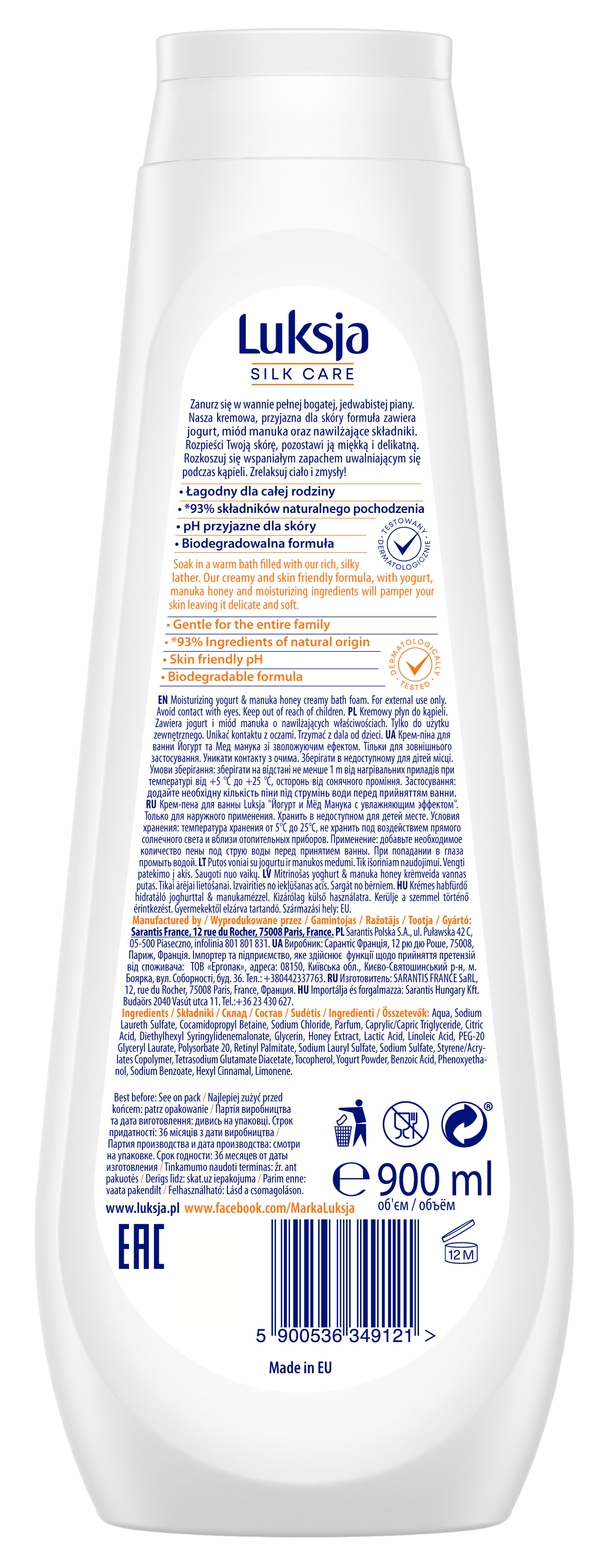 Zanurz się w wannie pełnej bogatej, jedwabistej piany. Kremowa, przyjazna dla skóry formuła Luksja Silk Care zawiera jogurt, miód manuka oraz kompleks witamin. Rozpieści Twoją skórę, pozostawi ją miękką i delikatną. Rozkoszuj się wspaniałym zapachem uwalniającym się podczas kąpieli. Zrelaksuj ciało i zmysły! Testowany dermatologicznie. Łagodny dla całej rodziny. pH przyjazne dla skóry. Biodegradowalna formuła. 93% składników pochodzenia.