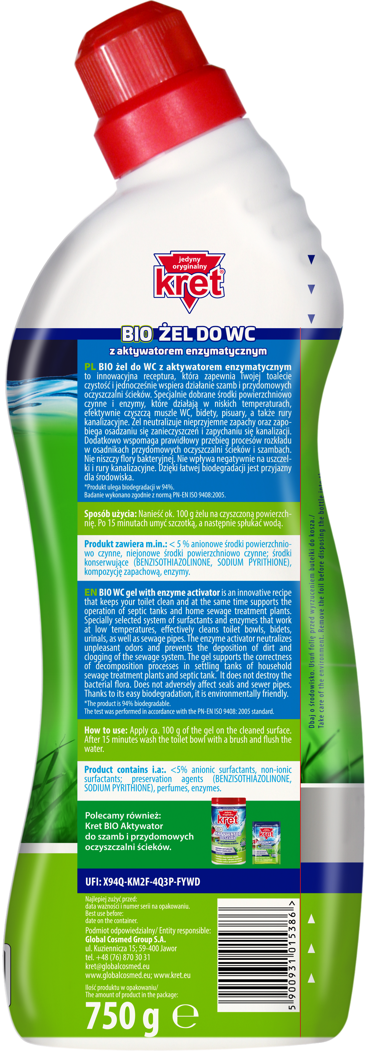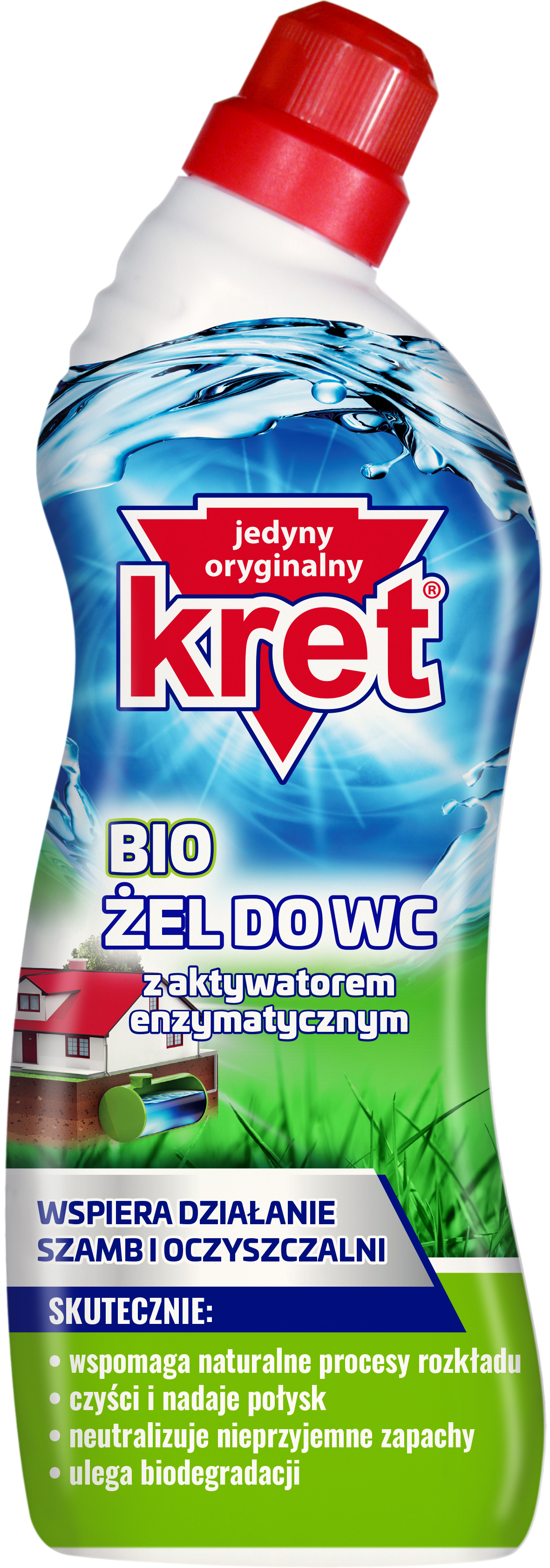 Nowoczesny żel do czyszczenia wc oparty na żywych kulturach bakterii, czyści, odka- mienia muszle wc, bidety, pisuary i rury kanalizacyjne. Aktywator biologiczny neutralizuje nieprzyjemne zapachy i zapobiega zapychaniu się kanalizacji. Wspomaga prawidłowy przebieg procesów biologicznych zachodzących w osadnikach i szambach przydomowych. Działa profilaktycznie specjalnie dobrany układ środków powierzchniowo czynnych zapobiega tworzeniu się kamienia w muszli i kanalizacji. Nie wpływa negatywnie na uszczelki i rury kanalizacyjne ani również na armaturę umywalek, wanien i bidetów. Przyjazny środowisku.