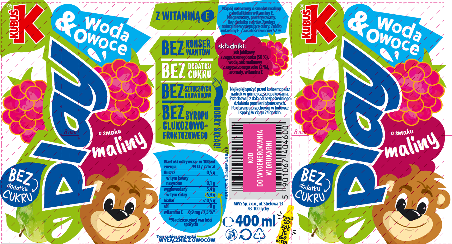 | Składniki | Sok jabłkowy (50%) z zagęszczonego soku, woda, sok malinowy (2%) z zagęszczonego soku, aromaty zawartość owoców 52% |