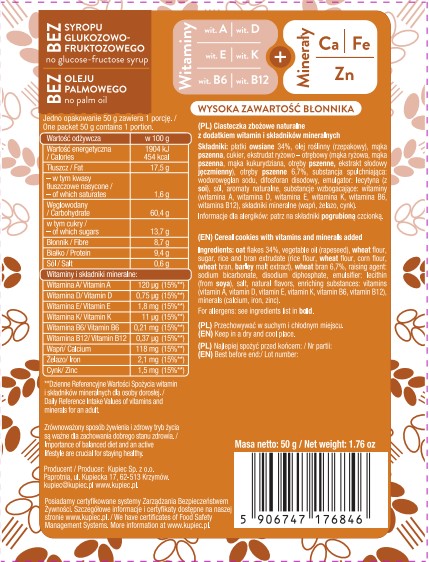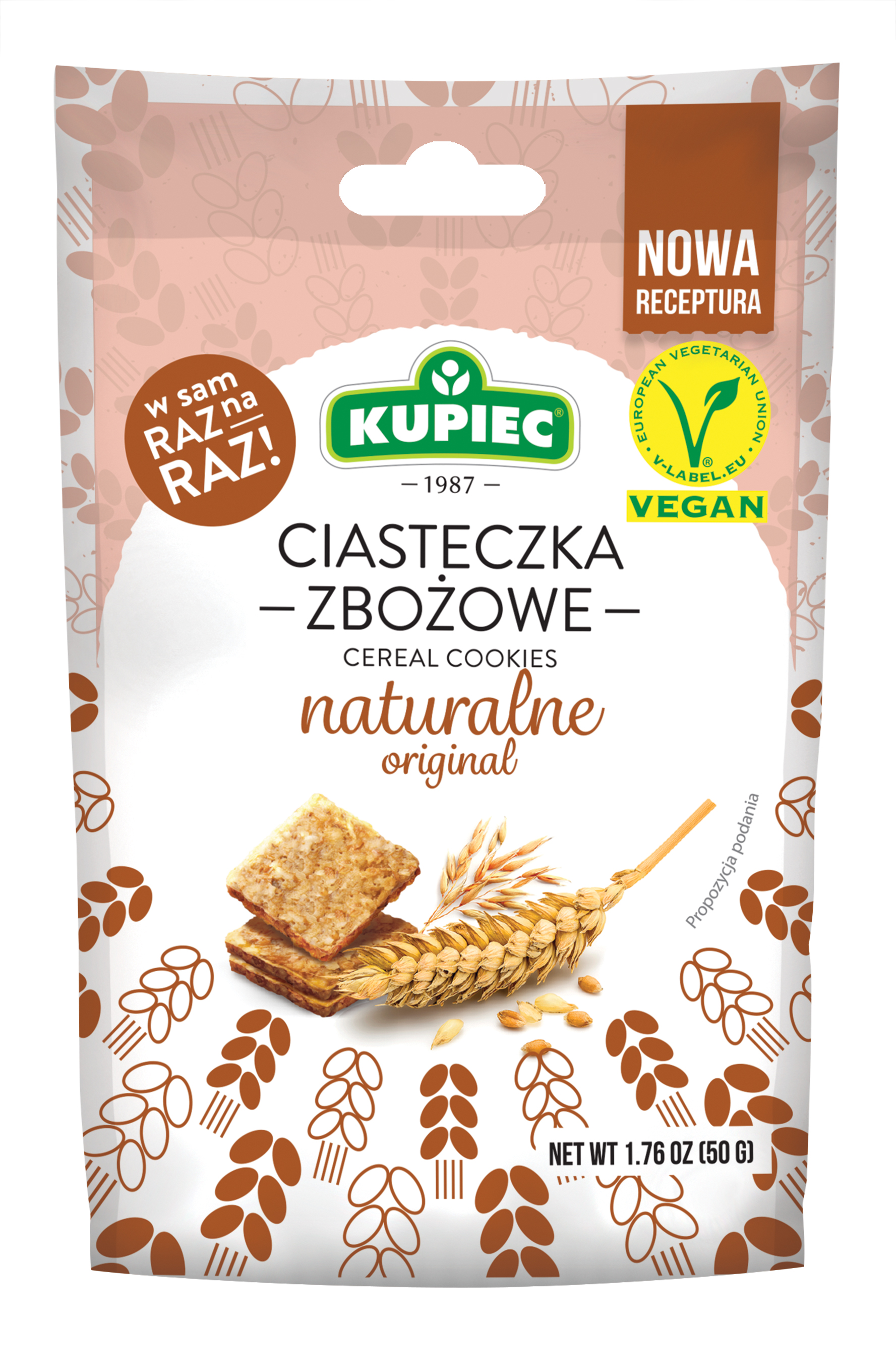Ciasteczka zbożowe firmy Kupiec to małe, chrupiące kwadraciki, zawierające otręby pszenne oraz płatki owsiane, które dzięki wysokiej zawartości błonnika pozostawiają uczucie sytości na wiele godzin. Małe ciasteczka są idealne na jeden kęs – w sam raz na raz. Ciasteczka zbożowe nie zawierają barwników ani konserwantów. Opakowanie zawiera 50 g produktu. Ciasteczka zbożowe , sam raz na raz.