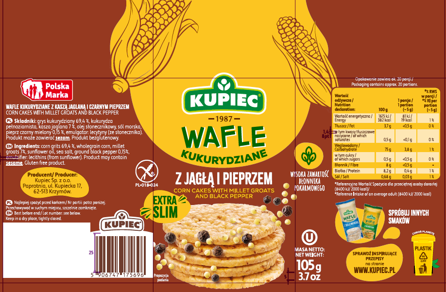 | Krótki opis marketingowy | Wafle kukurydziane z jagłą i pieprzem 105 g |