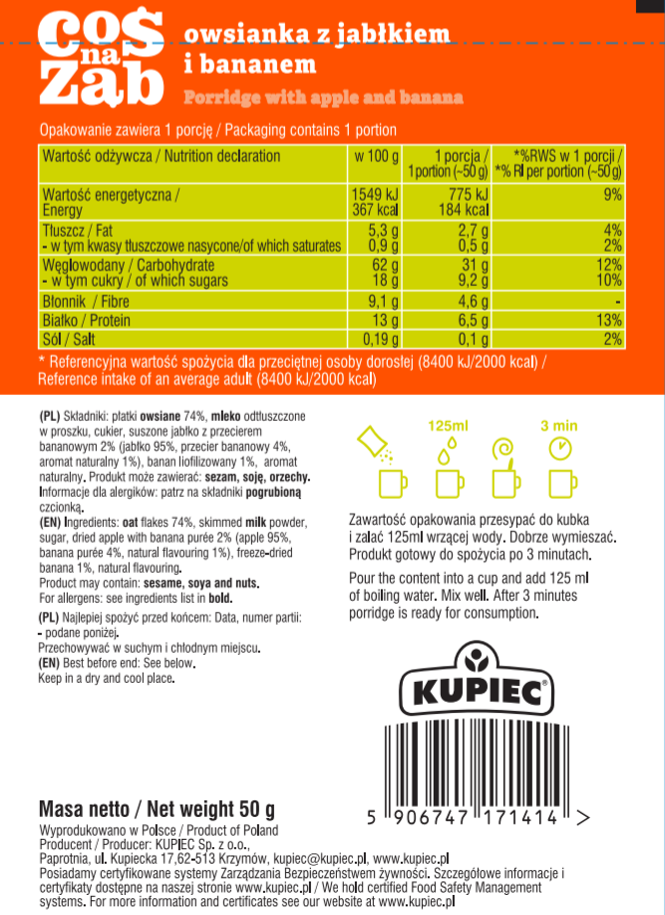 Masz trzy minuty o poranku? To w zupełności wystarczy, żeby przygotować zdrowe i pożywne śniadanie. Wystarczy zalać owsiankę Coś na Ząb gorącym mlekiem, wodą lub zimnym jogurtem i gotowe. Jabłka i banany dopełnią smaku owsianki i pozwolą w pełni cieszyć się szybkim, lecz zdrowym posiłkiem. Zalet owsianki jest naprawdę wiele i nie trzeba chyba nikogo do niej przekonywać. Wystarczy powiedzieć, że to bogactwo minerałów i witamin, a także źródło błonnika i cennych kwasów tłuszczowych. Jej wartości odżywcze oraz różnorodność smaków i dodatków powoduje, że owsianka wróciła do łask.