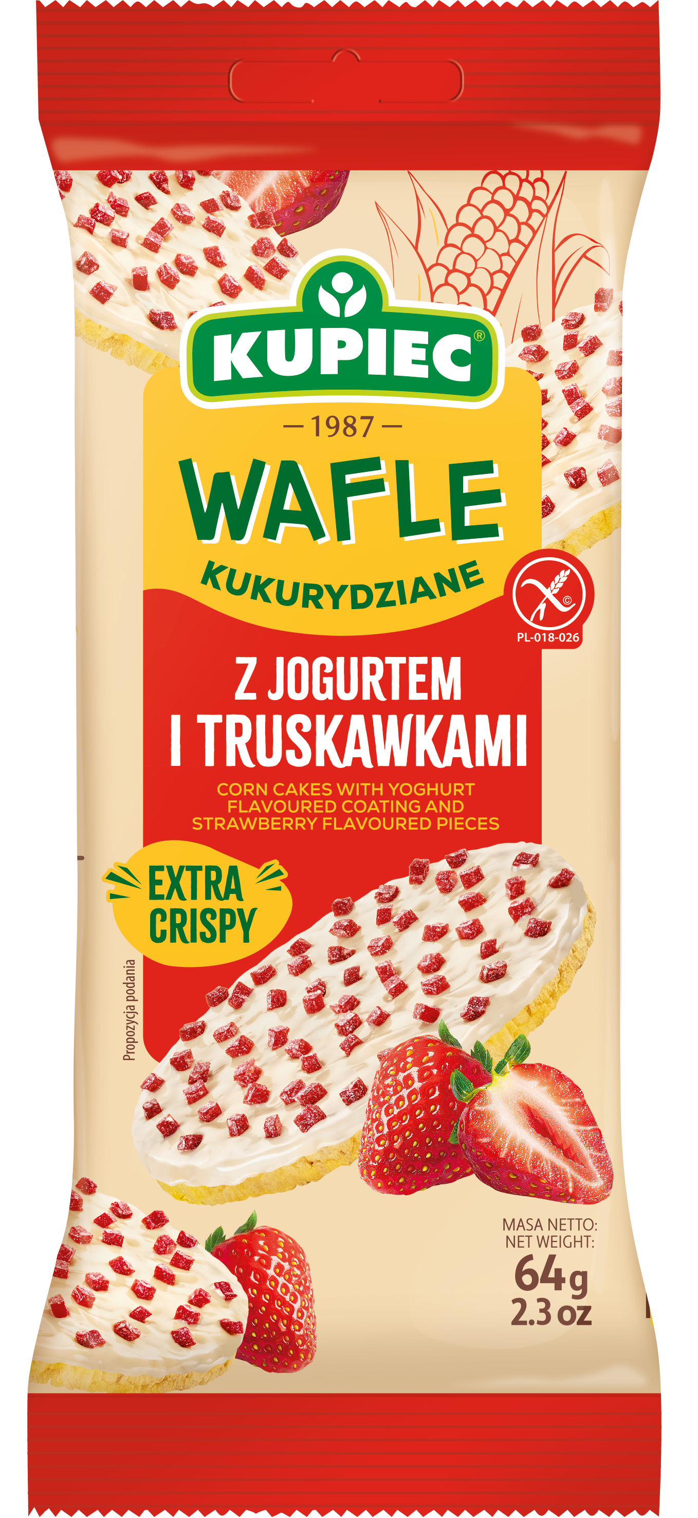 Nowe oblewane wafle kukurydziane to świetna przekąska na każdą okazję – na drugie śniadanie w pracy lub szkole, jako deser po wytrawnym posiłku, czy słodki dodatek do kawy. To idealna propozycja także dla osób na diecie bezglutenowej. Dzięki nietuzinkowemu połączeniu lekko wytrawnej kukurydzy ze słodyczą smaków dzieciństwa w postaci polewy jogurtowej z kosteczką truskawkową, nowe wafle Kupiec zapewniają wyjątkowe doznania smakowe prawdziwym entuzjastom.