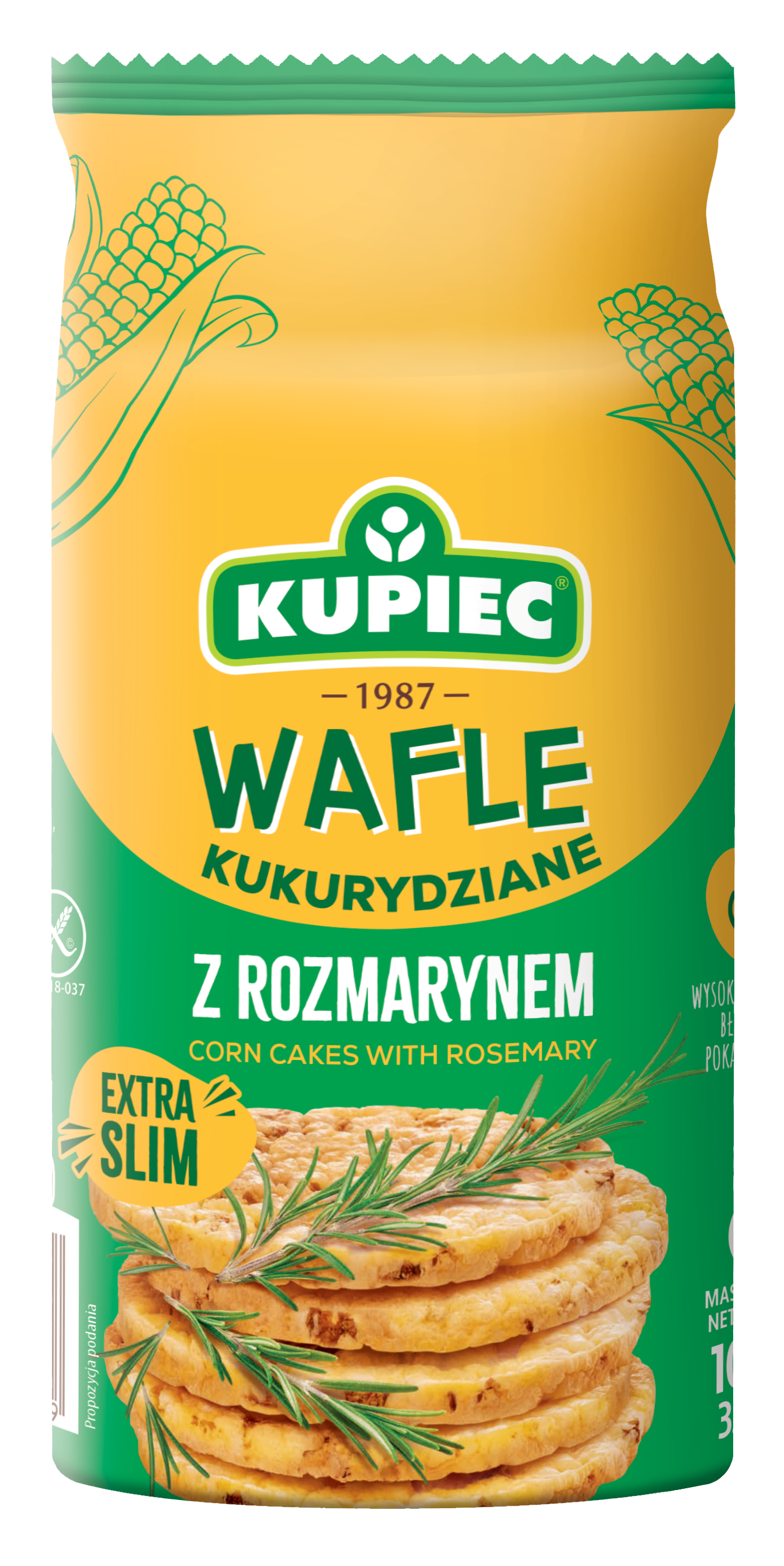 Wafle kukurydziane z rozmarynem to produkt wyjątkowy, gdyż nawiązuje do walorów kuchni śródziemnomorskiej, w której często stosuje się kukurydzę w połączeniu z zielonymi przyprawami. W waflach wypiekanych z kukurydzy wykorzystano aromatyczny rozmaryn, który jest szczególnie ceniony za swoje walory smakowe. Produkt komponuje się idealnie ze świeżymi pomidorami, oliwkami i delikatną mozzarellą, ale można go też stosować jako zamiennik pieczywa do kanapek. Wafle charakteryzują się też wysoką zawartością błonnika oraz są wolne od glutenu.