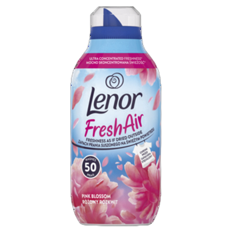 Ciesz się świeżością ubrań suszonych na zewnątrz, nawet jeśli suszysz je w domu! Wysoce skoncentrowana formuła świeżości Lenor Fresh Air jest bardziej skoncentrowana w porównaniu z innymi płynami do płukania Lenor, dzięki czemu mniejsza butelka wystarcza na 50 prań. Innowacyjna technologia sprawia, że wystarczy niewielka ilość płynu, aby można było cieszyć się świeżym zapachem tkanin, niezależnie od pogody! W połączeniu z ochroną przed przykrym zapachem, płyn do płukania tkanin Lenor Fresh Air Pink Blossom daje uczucie długotrwałej świeżości. Poczuj ten świeży kwiatowy zapach! Połączenie świeżych i łagodnych nut z ochroną przed przykrym zapachem daje uczucie długotrwałej świeżości. Plastikowa butelka z recyklingu, z wyjątkiem nakrętki, końcówki i etykiety. Płyn do płukania tkanin Lenor Fresh Air został opracowany we współpracy z konsumentami, aby odtworzyć efekt świeżości otwartych przestrzeni. Uwalnia świeży zapach po wysuszeniu tkanin, podczas ich przechowywania w szafie, a nawet podczas ich noszenia.
