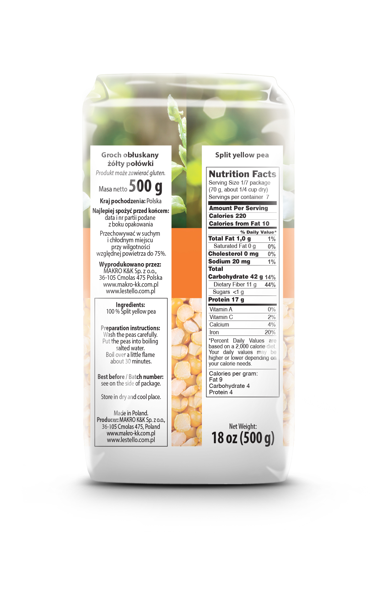 | Składniki | 100% groch łuskany. produkt może zawierać gluten. |