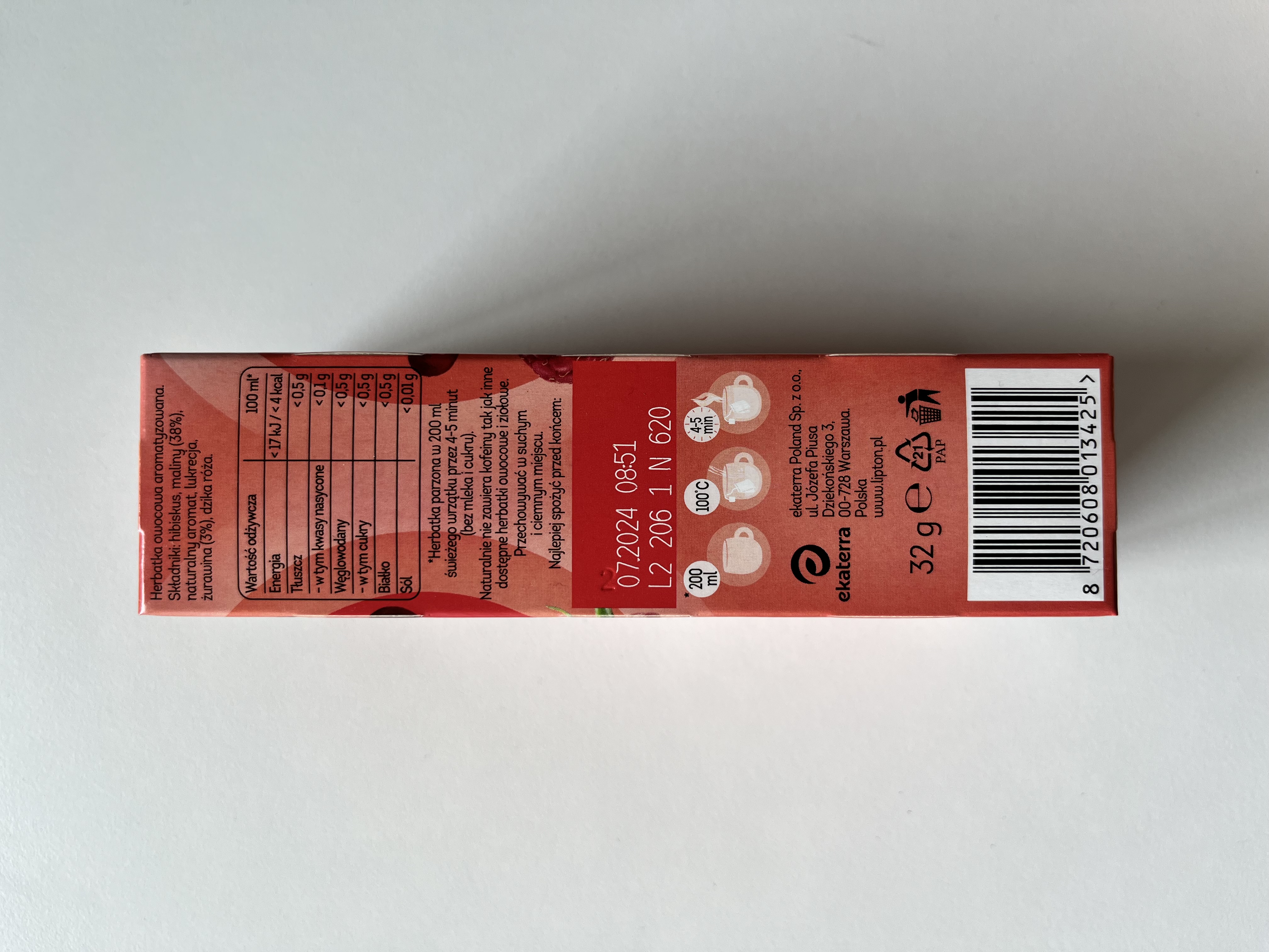 | Składniki | Składniki: hibiskus, maliny (38%), aromat, lukrecja, żurawina (3%), dzika róża. |