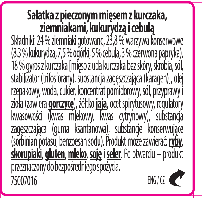 | Składniki | 24 % ziemniaki gotowane, 23,8 % warzywa konserwowe (8,3 % kukurydza, 7,5 % ogórki ,5 % cebula, 3 % czerwona papryka), 18 % gyros z kurczaka [mięso z uda kurczaka bez skóry, skrobia, sól, stabilizator (trifosforany), substancja zagęszczająca (karagen)], olej rzepakowy, woda, cukier, koncentrat pomidorowy, sól, przyprawy i zioła (zawiera gorczycę), żółtko jaja, ocet spirytusowy,regulatory kwasowości (kwas mlekowy, kwas cytrynowy), substancja zagęszczająca (guma ksantanowa), substancje konserwujące (sorbinian potasu, benzoesan sodu). produkt może zawierać: ryby, skorupiaki, gluten, mleko, soję i seler. |