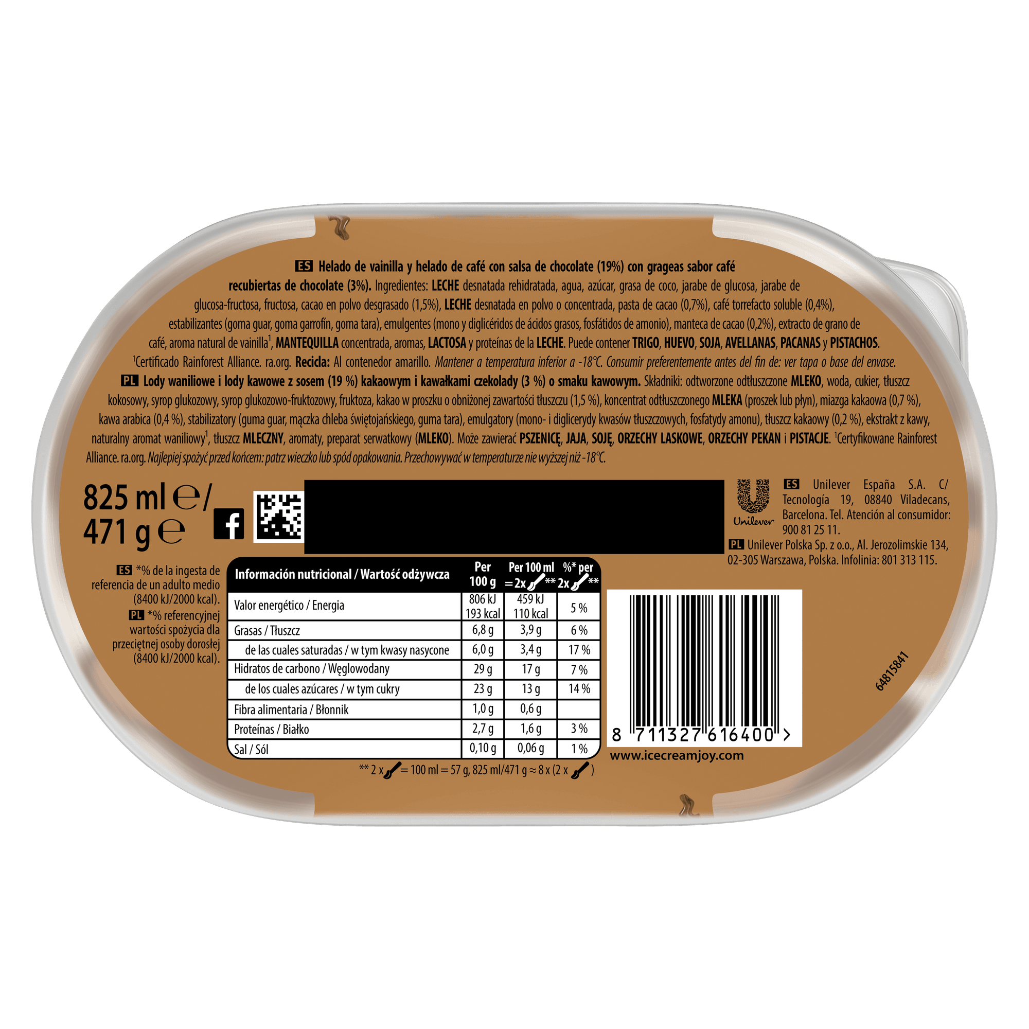 | Składniki | Odtworzone odtłuszczone mleko, woda, cukier, tłuszcz kokosowy, syrop glukozowy, syrop glukozowo-fruktozowy, fruktoza, kakao w proszku o obniżonej zawartości tłuszczu (1,5 %), koncentrat odtłuszczonego mleka (proszek lub płyn), miazga kakaowa (0,7 %), kawa arabica (0,4 %), stabilizatory (guma guar, mączka chleba świętojańskiego, guma tara), emulgatory (mono- i diglicerydy kwasów tłuszczowych, fosfatydy amonu), tłuszcz kakaowy (0,2 %), ekstrakt z kawy, aromat waniliowy1, tłuszcz mleczny, aromaty, preparat serwatkowy (mleko). może zawierać pszenicę, jaja, soję, orzechy laskowe, orzechy pekan i pistacje. |