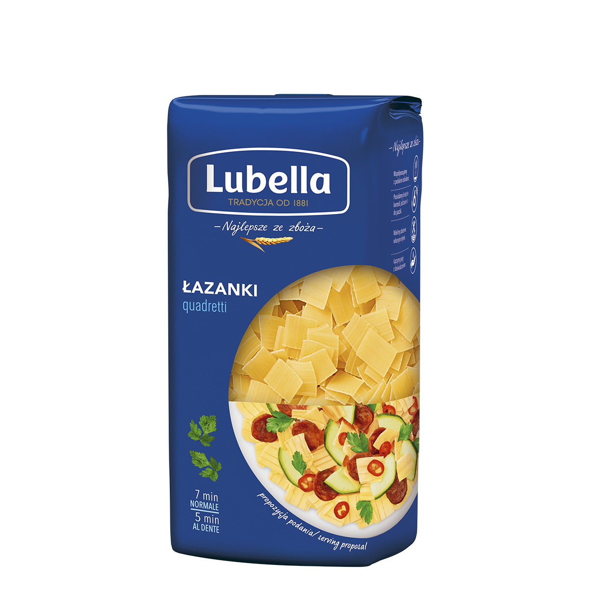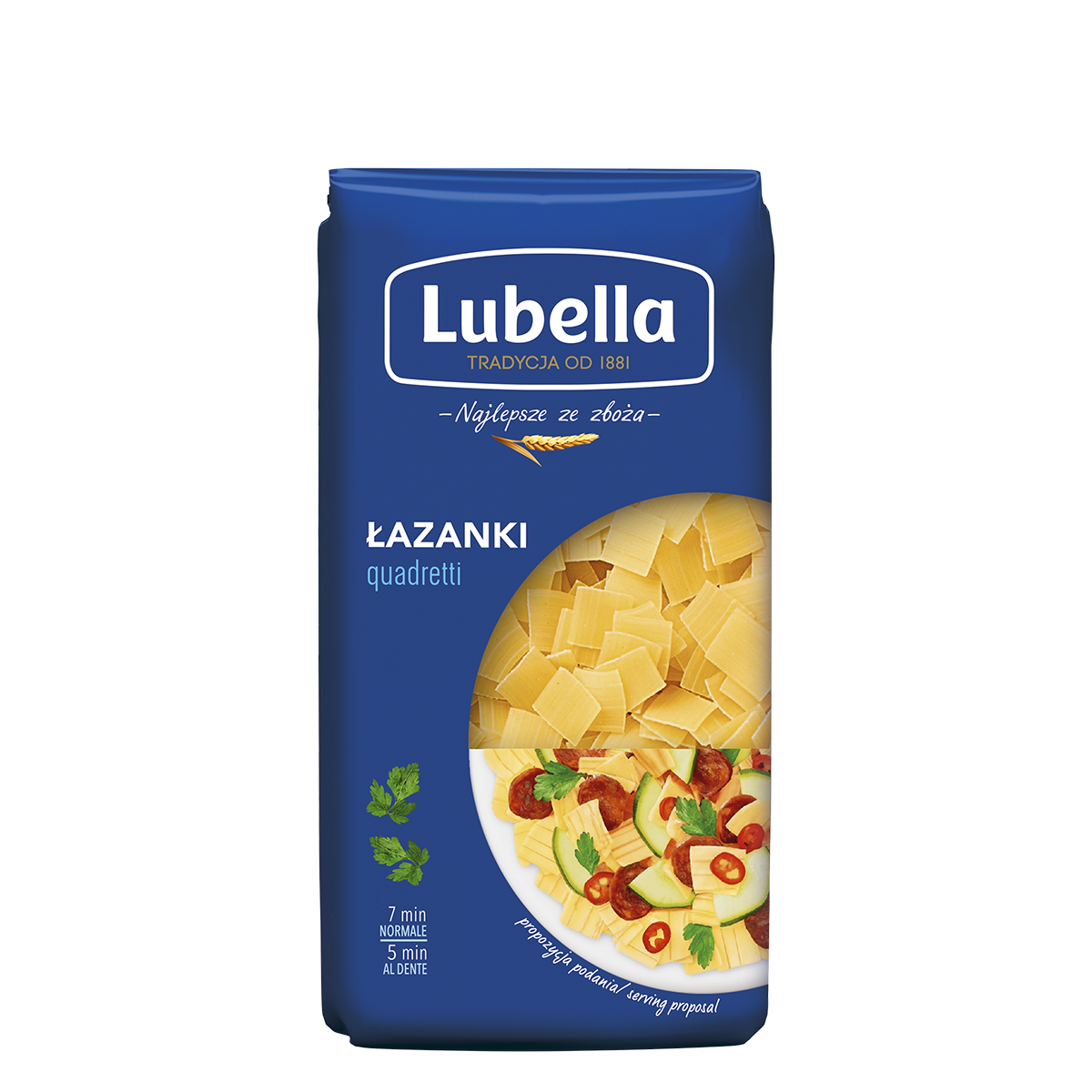 Lubella łazanki to forma makaronu doskonale znana w polskich kuchniach, głównie za sprawą połączenia z kapustą, grzybami czy mięsem. Małe kwadraciki wspaniale sprawdzają się również jako dodatek do zup.