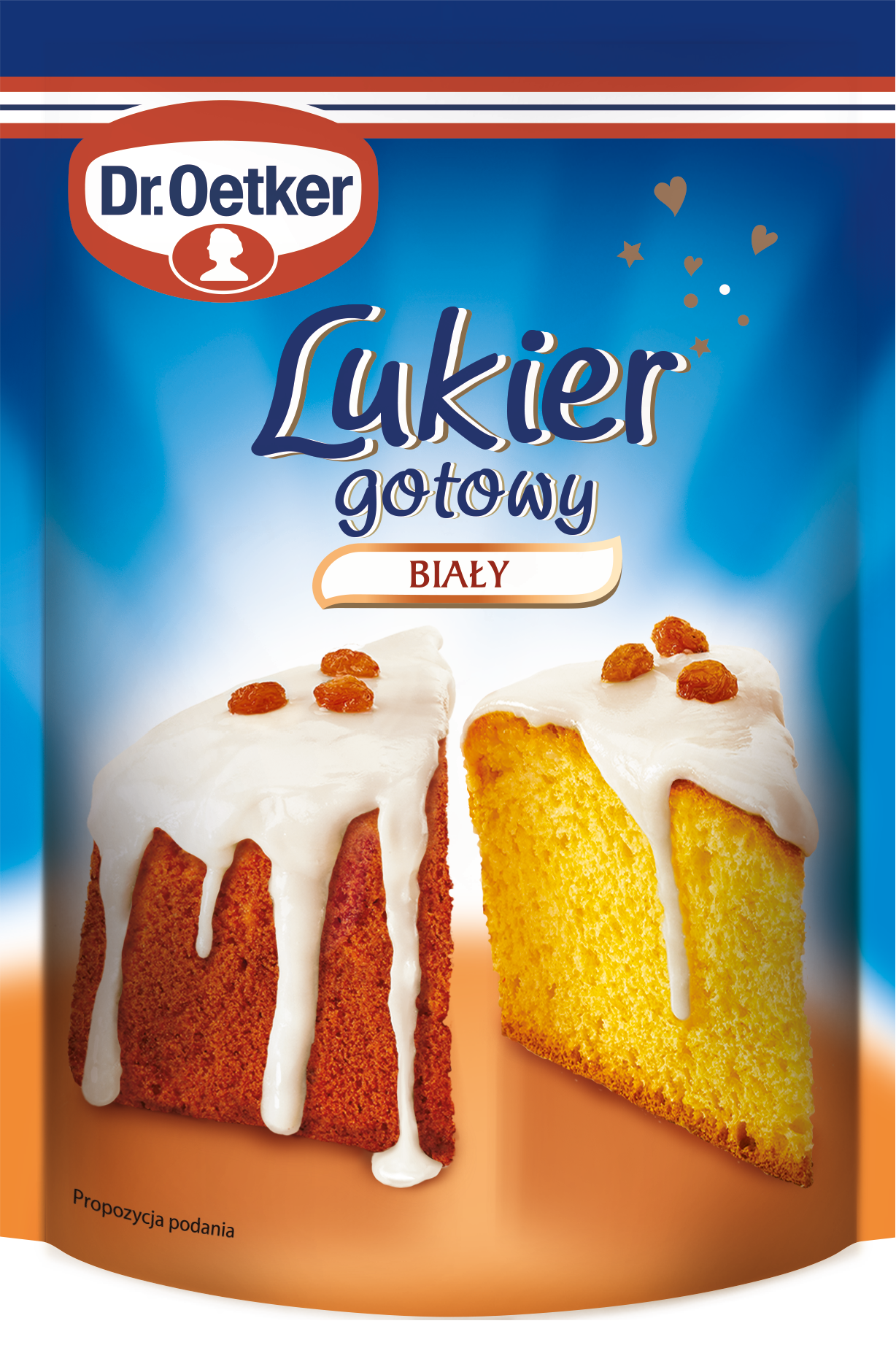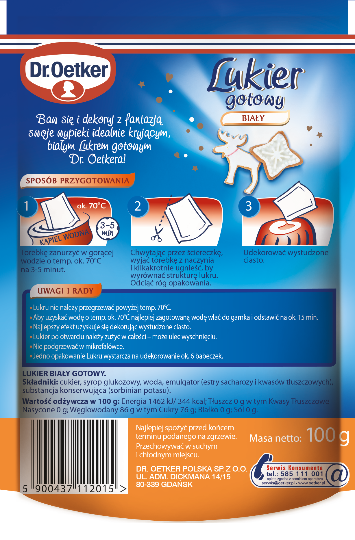 Gotowy Lukier gotowy biały to bardzo prosta w przygotowaniu i niezwykle efektowna dekoracja wszelkich wypieków, szczególnie pomocna przy tworzeniu klasycznych stylizacji. Wystarczy zanurzyć produkt na 3-5 minut w gorącej wodzie i wylać gotowy lukier na ciasto. Lukier jest niezwykle gładki i idealnie kryjący, a do tego wspaniale smakuje! Pamiętaj, że Lukier stanowi idealne tło dla innych dekoracji np. pisaków albo cukrowych posypek. Jedna torebka wystarcza na udekorowanie ok. 6 babeczek.