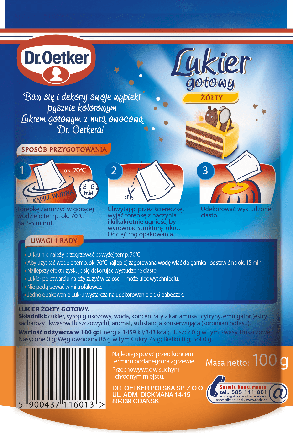 Lukier to klasyczna polewa przygotowana na bazie cukru od lat wykorzystywana do dekoracji ciast: bab, babeczek, serników, makowców, pierników, pączków, ciasteczek… Lista wypieków oblewanych lukrem jest wyjątkowo długa, a gotowanie prawdziwego lukru w domu zgodnie z przepisem nie raz przysporzyło problemów nawet wprawionym w pieczeniu paniom domu. Nareszcie koniec z pracochłonnym przygotowaniem lukru, teraz wystarczy zanurzyć torebkę z produktem na kilka minut w ciepłej wodzie i wylać gotowy lukier na ciasto. W naszej ofercie dla urozmaicenia twoich wypieków oprócz klasycznego lukru białego, znajdziesz cztery pastelowe kolory lukrów o delikatnym owocowym smaku: różowy, żółty, zielony i niebieski. Kolorowe lukry przygotowaliśmy głównie z myślą o najmłodszych, używane do dekoracji babeczek i kruchych ciasteczek jako tło dla innych dekoracji np. pisaków i posypek pobudzą ich dziecięcą wyobraźnię, a fantazyjne, kolorowo udekorowane wypieki z pewnością przysporzą dużo radości całej rodzinie.