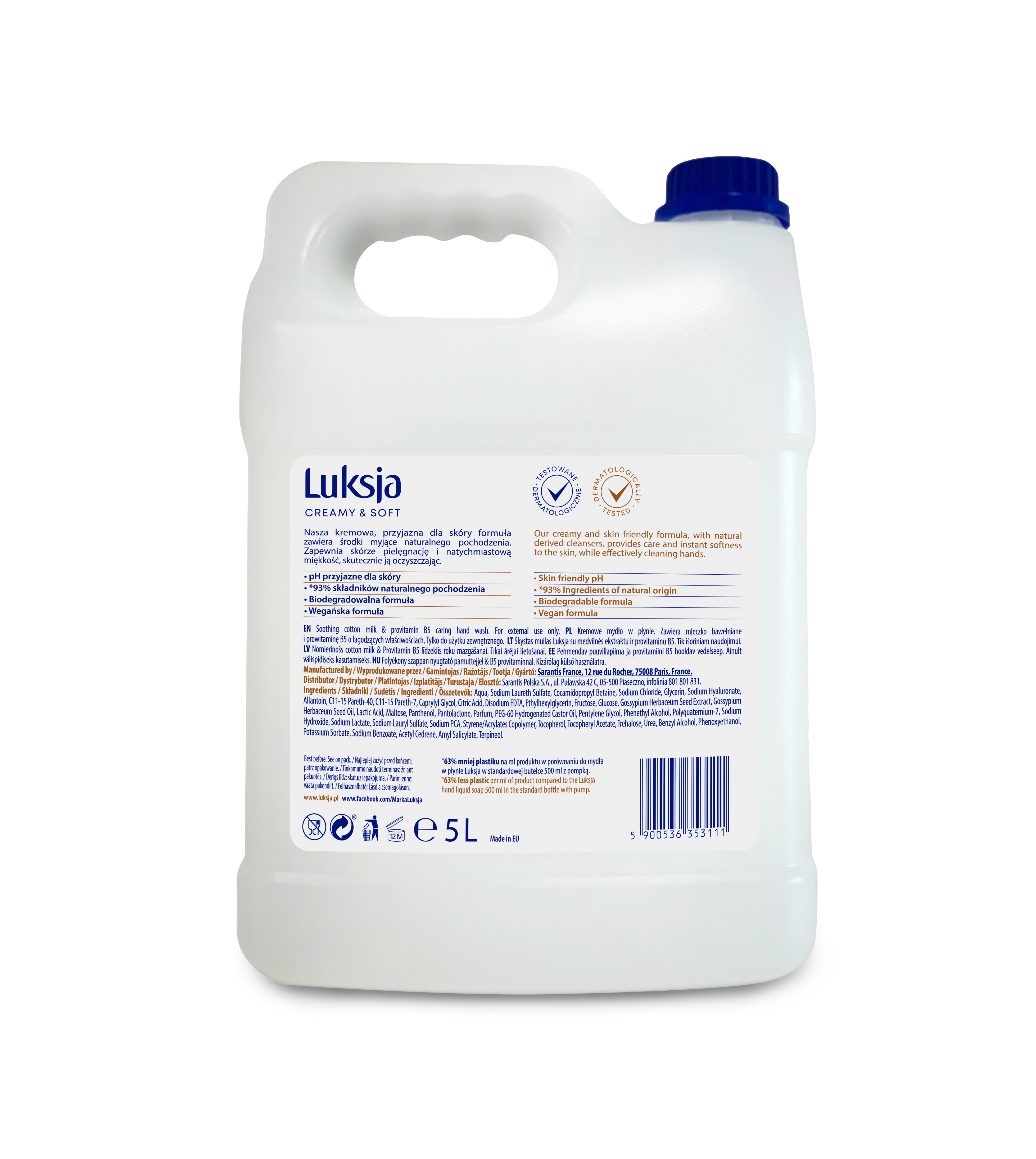 Luksja Creamy & Soft Kremowe mydło w płynie Mleczko bawełniane i Prowitamina B5 5 l opakowanie uzupełniające