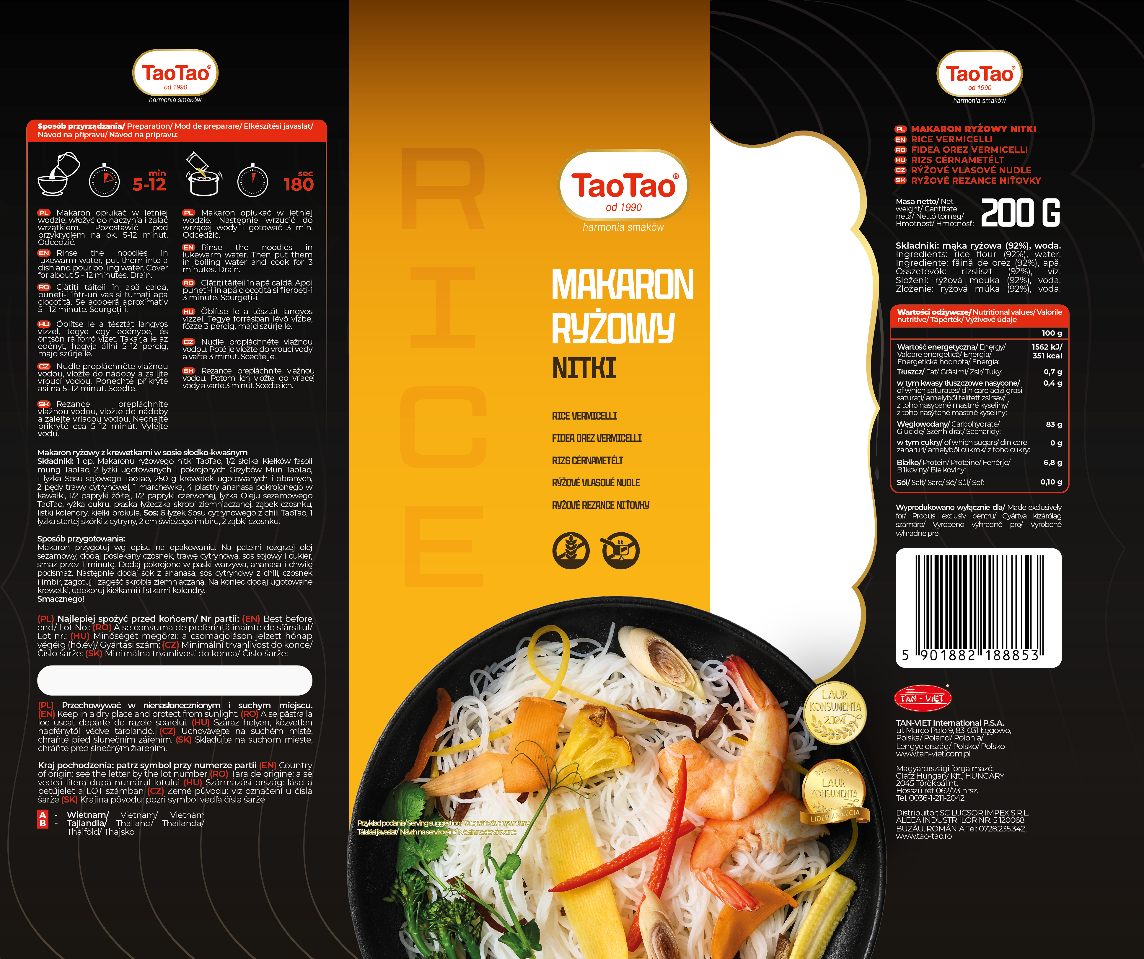Makaron ryżowy wstążki TaoTao to produkt bezglutenowy, powstaje wyłącznie z składników: mąki ryżowej i wody. Makaron ryżowy wstążki TaoTao ma postać długich wstążek. Cechuje go delikatny smak, który idealnie komponuje się z wieloma potrawami, zarówno orientalnymi jak i . Jego zwarta struktura, świetnie sprawdza się podczas smażenia. Doskonale pasuje również do zup.