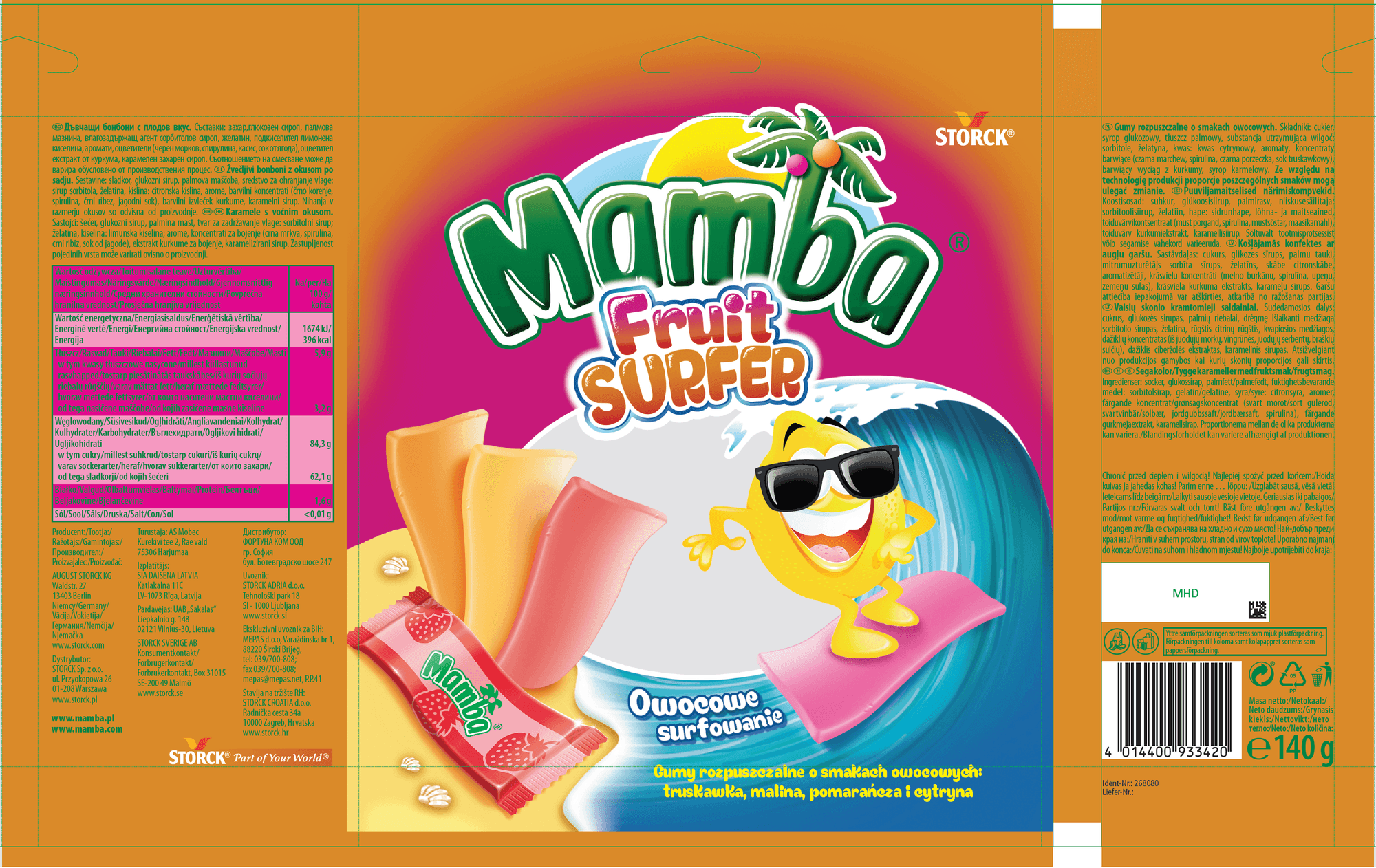 Prawdziwie owocowe surfowanie z Mambą Fruit Surfer. Świetna zabawa w wykręcanie i wyginanie gum dzięki ich elastycznej konsystencji. Uwielbiane smaki przez dzieci: truskawka, malina, pomarańcza i cytryna. Pojedynczo pakowane płaskie listki zapewniają świeżość w każdym momencie.