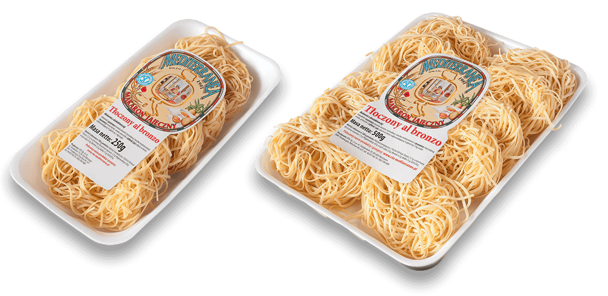 Pyszny, makaron pszenny, jajeczny w postaci grubych nitek.