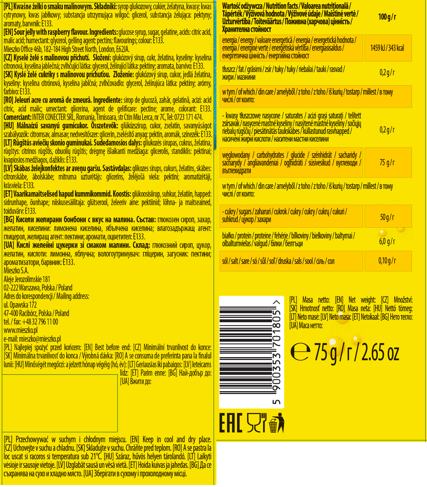 | Krótki opis marketingowy | Kwaśne żelki o smaku malinowym barwiące język. |