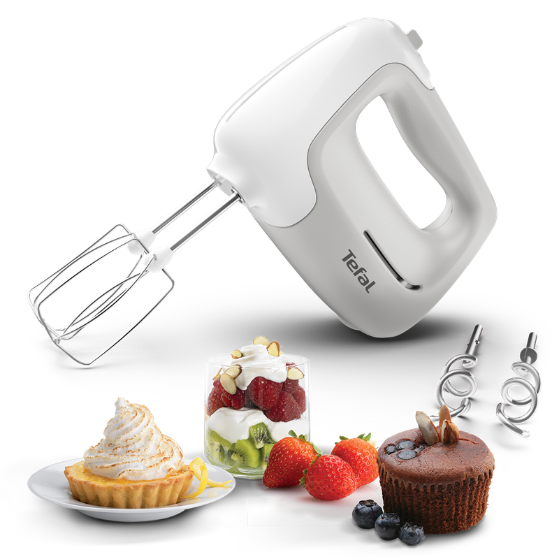 Komfortowa obsługa z ErgoMixx Silnik o dużej mocy 450 W: zapewnia doskonałe rezultaty przy każdym zadaniu pieczenia lub gotowania. Wyprofilowane mieszadła ze stali nierdzewnej i haki do ciasta: zapewniają idealne mieszanie, ubijanie i ugniatanie. Ergonomiczny uchwyt Soft Touch: idealnie pasuje do każdej dłoni, zapewniając wygodne i bezpieczne miksowanie. 5 prędkości pracy i funkcja turbo: precyzyjna kontrola prędkości dla każdego przepisu. Przycisk zwalniający: wyjmij mieszadła lub haki za jednym naciśnięciem przycisku.