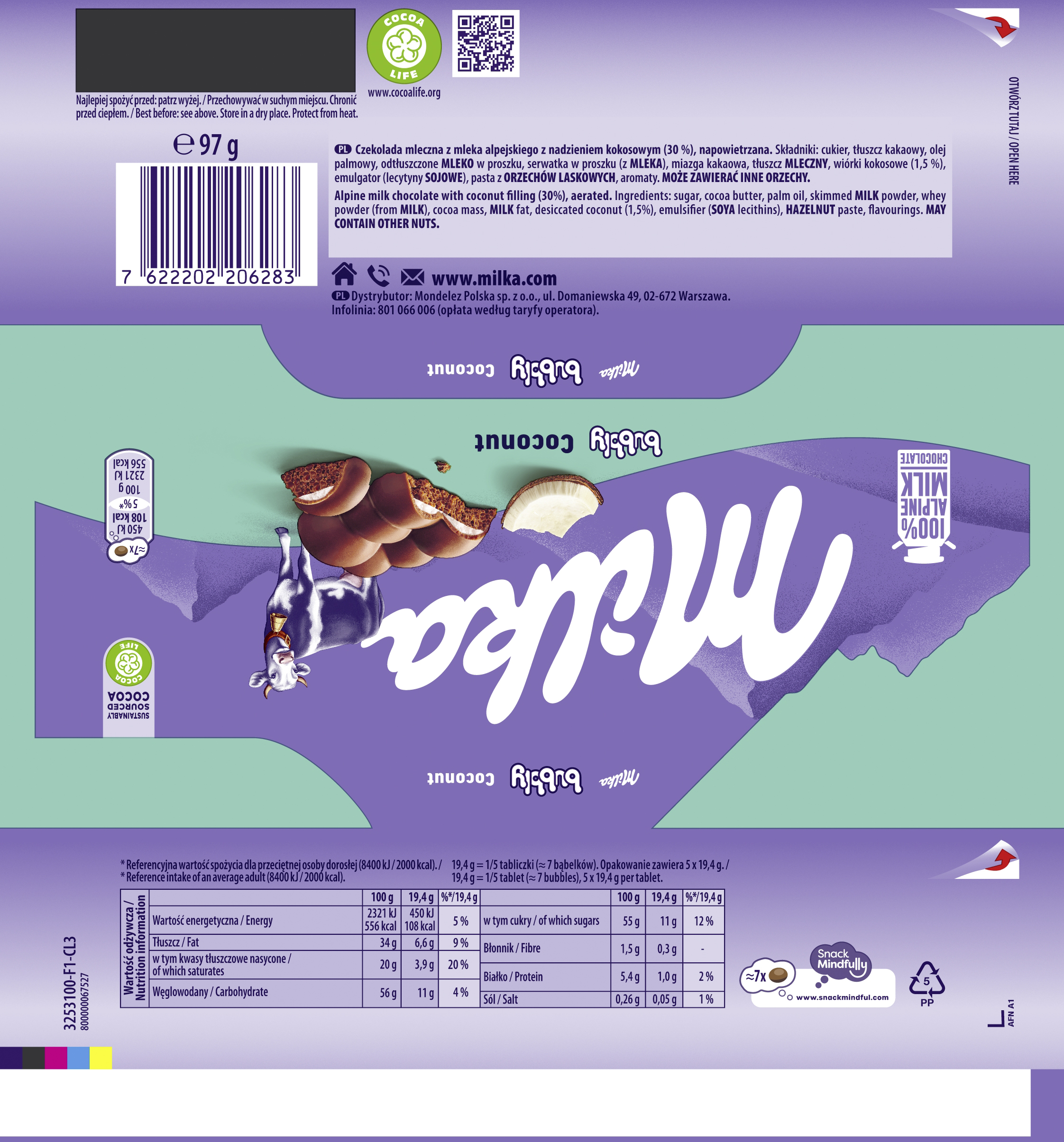 Czekolada mleczna z mleka alpejskiego z nadzieniem kokosowym, napowietrzana.